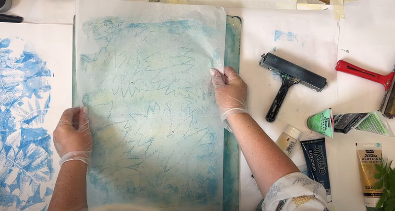 Next, I gently press my tissue paper print from Part 5 onto the gel plate to pick up the remaining teal paint.