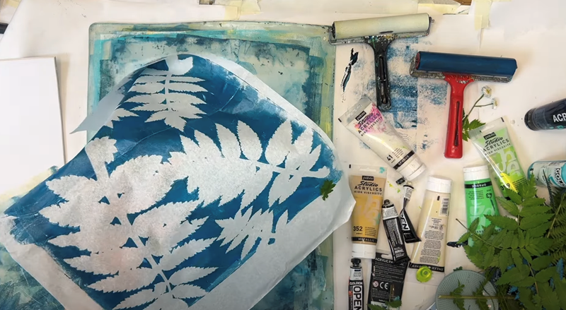 We’ll begin by applying a small amount of Cerulean Blue paint straight onto the gel plate. Using my brayer, I gently roll it out into a smooth, even layer—just enough to cover the surface without streaks or thick patches. I'm aiming for a clean base that will beautifully capture the textures of my plant materials.