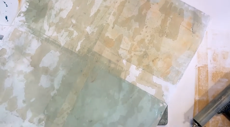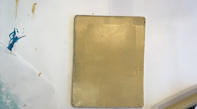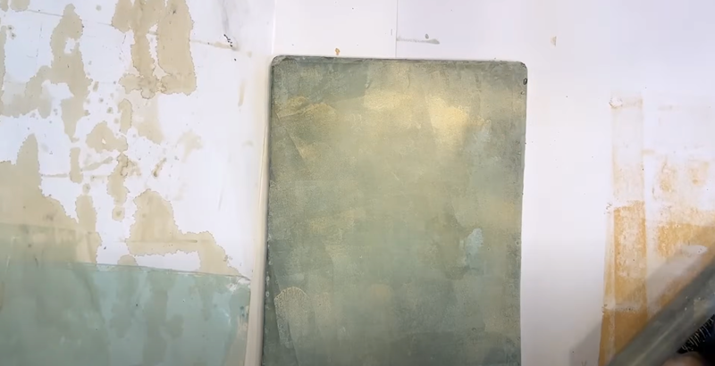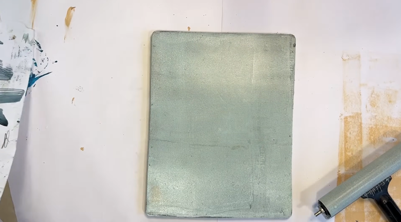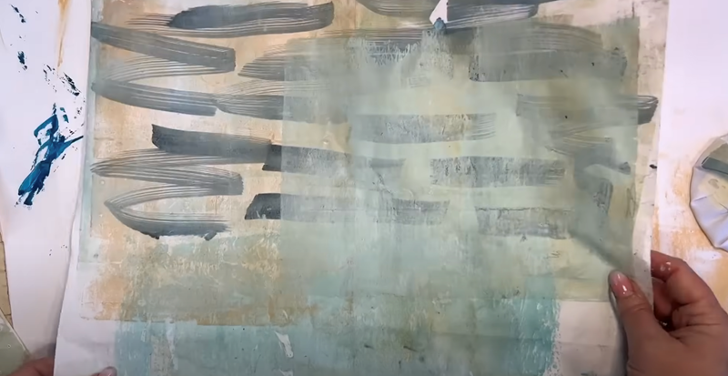 I start by rolling a layer of Prussian blue onto the Gelli plate, lay the stencils on top. After that, I cover everything with a layer of pale green paint.