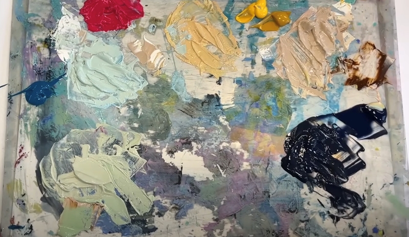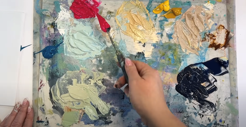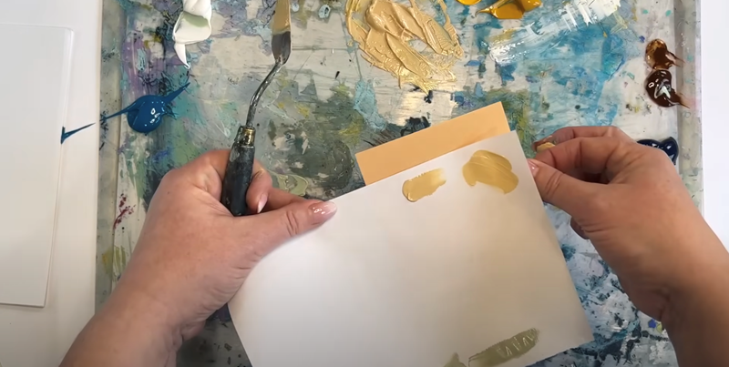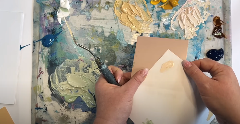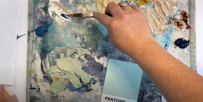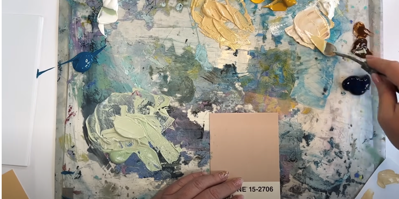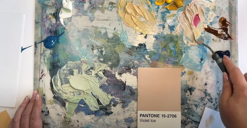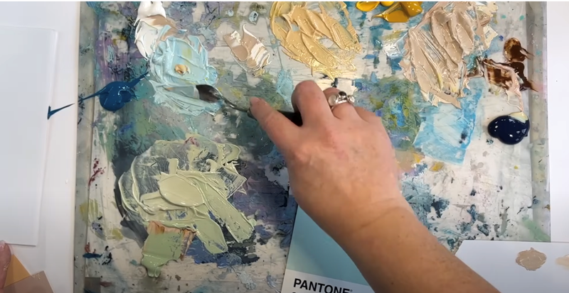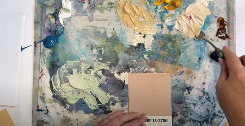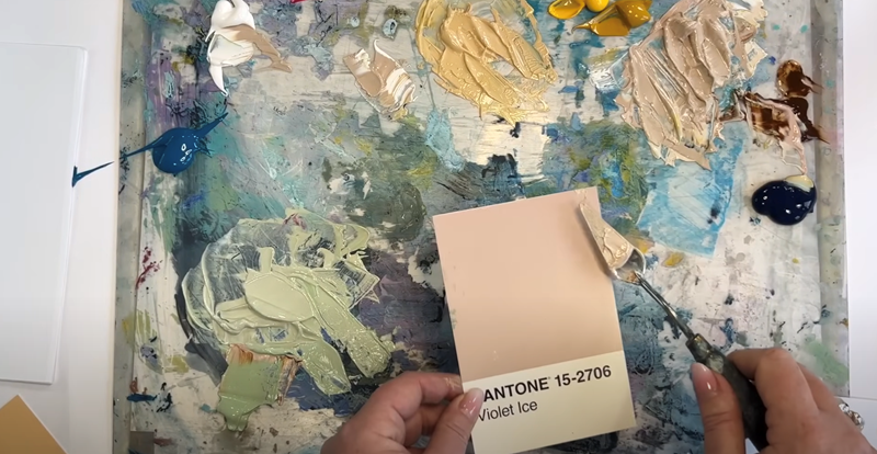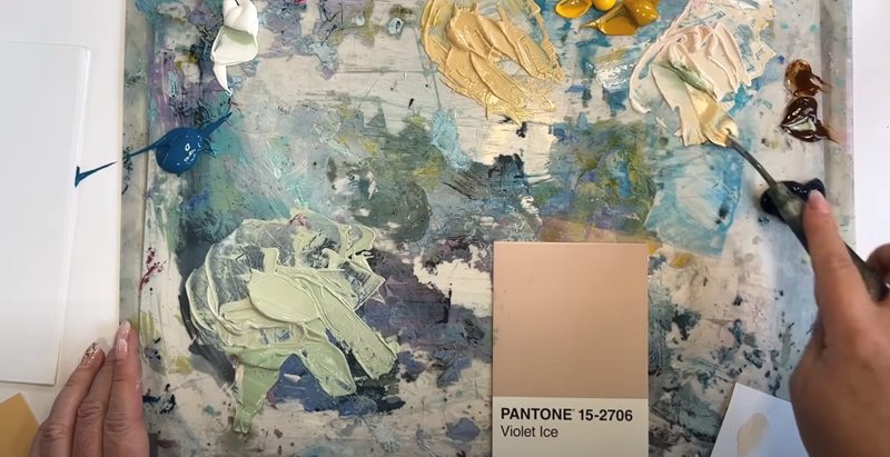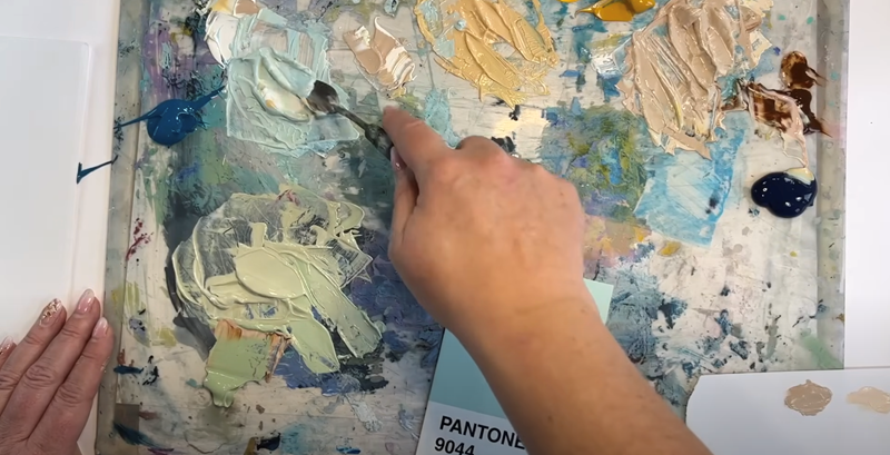 To match this Pantone yellow, I’ll begin by mixing Yellow Ochre with Naples Yellow, while leaving a small amount of the pale olive on my palette knife. This little blending trick helps the whole colour palette become more harmonious.