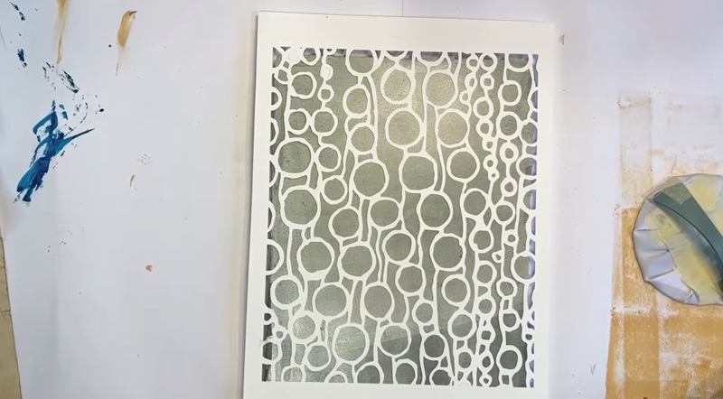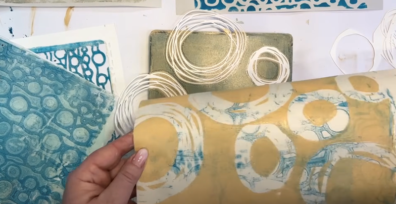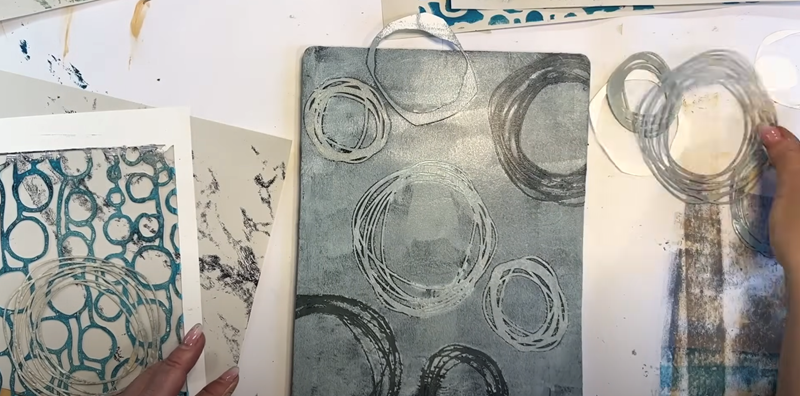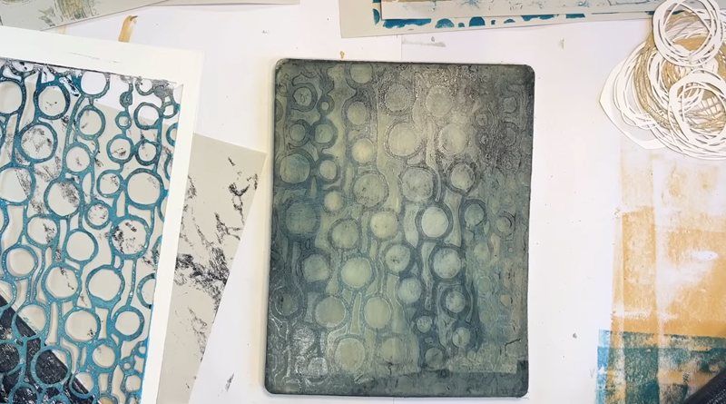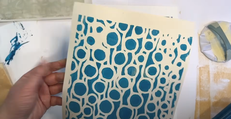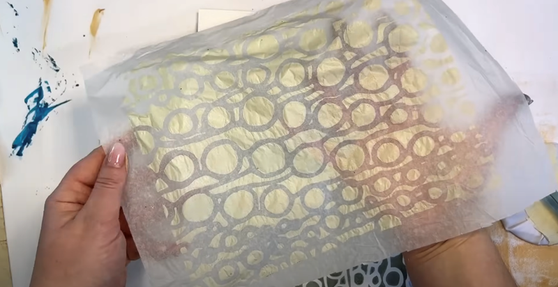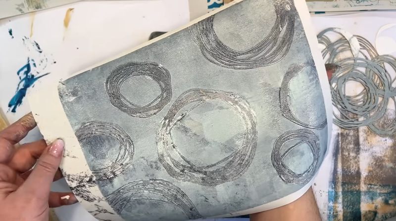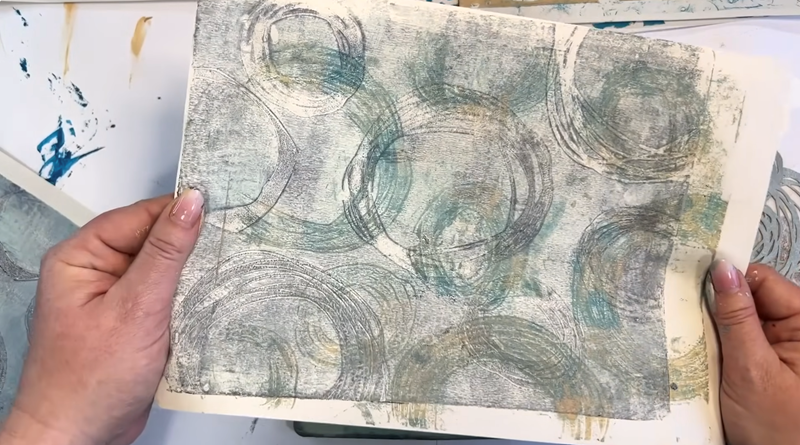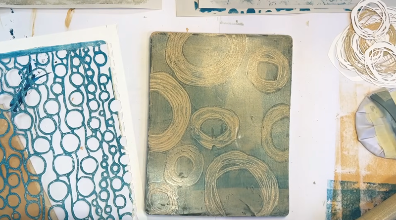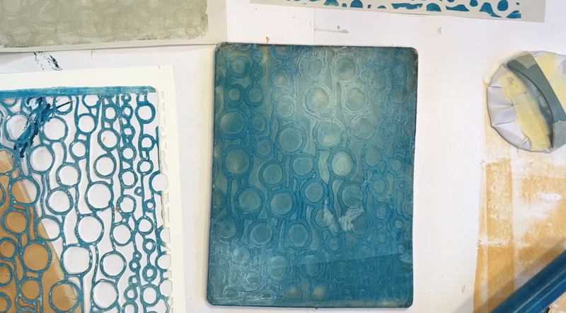 Now that our base papers are ready, it’s time to experiment with stencils! I’m starting with duck egg blue paint on the Gelli plate, paired with this lovely circle-patterned stencil.