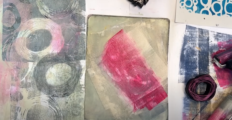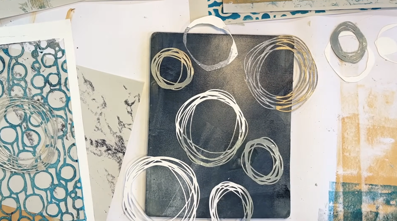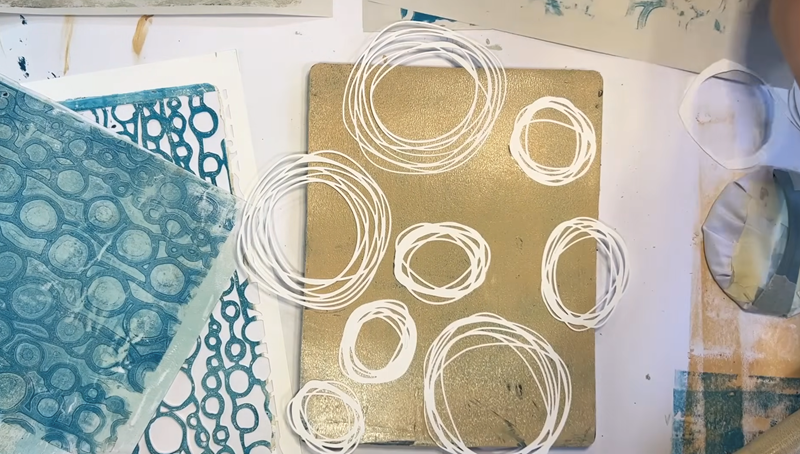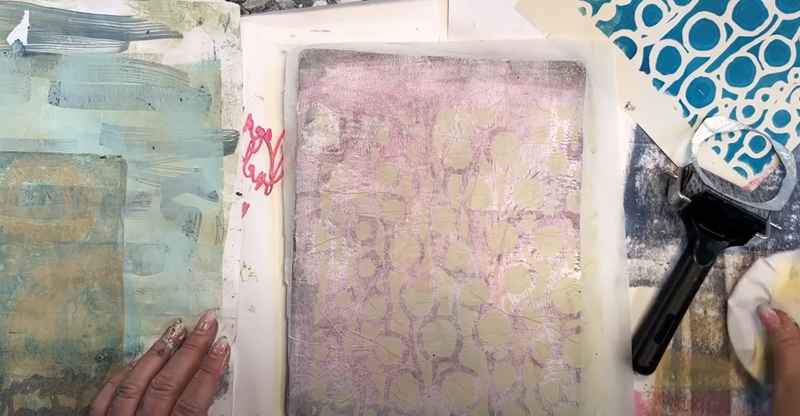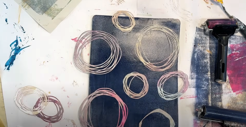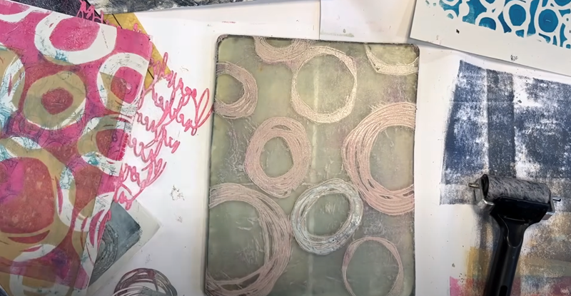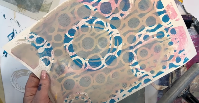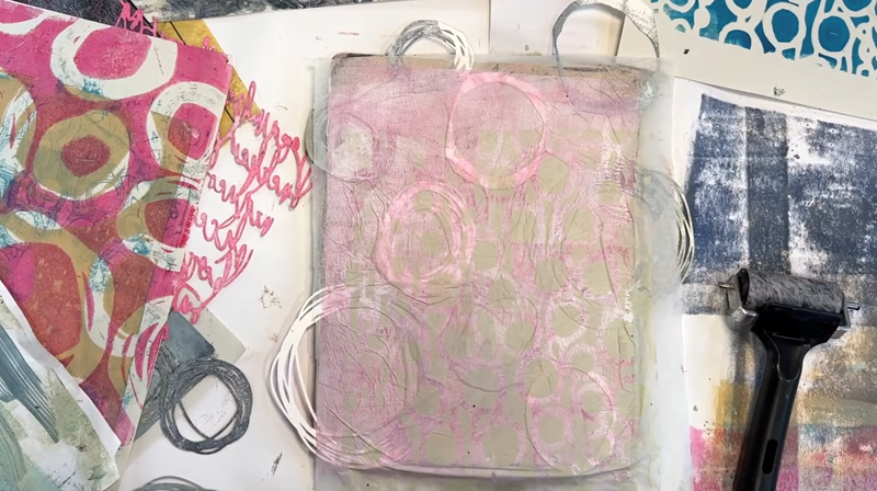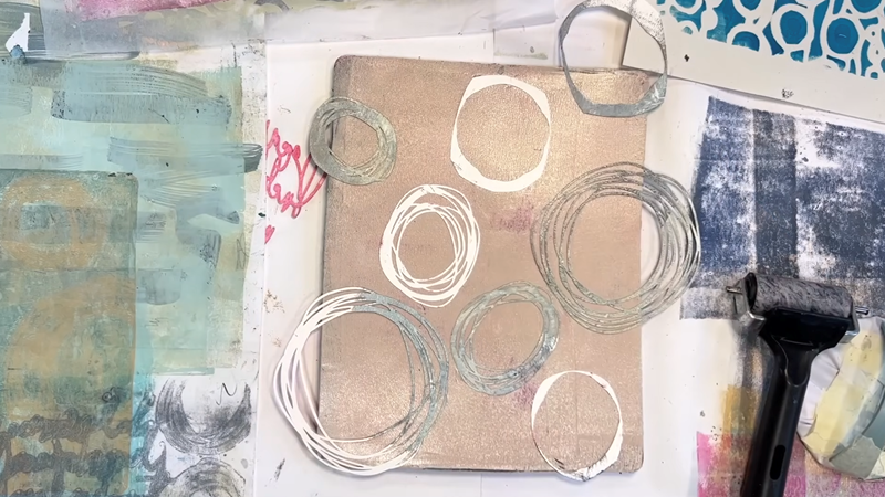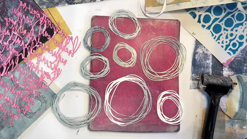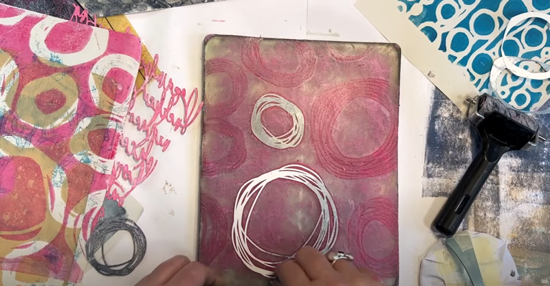 Now I’m just capturing those pink circle shapes left on the Gelli plate—the ghost prints—by rolling a layer of white paint over them.
