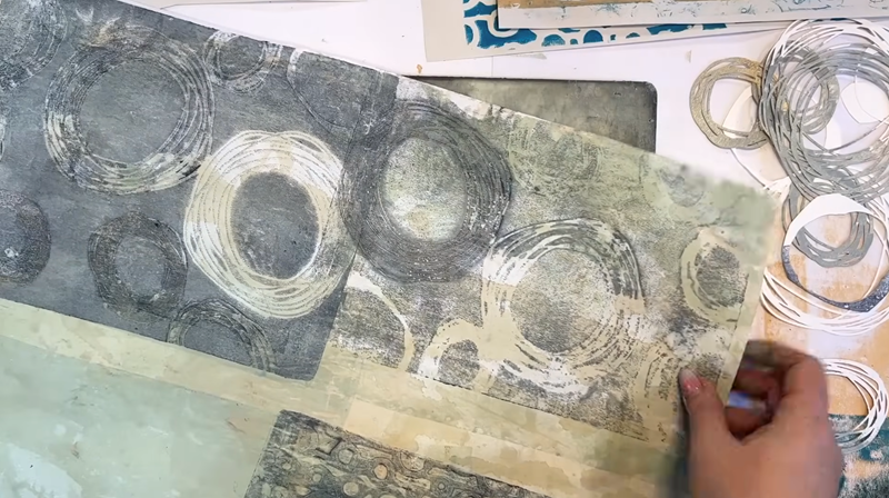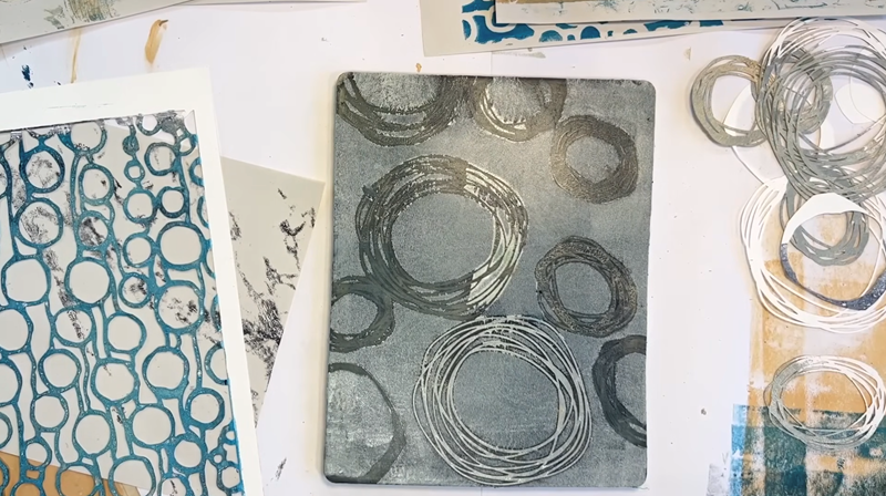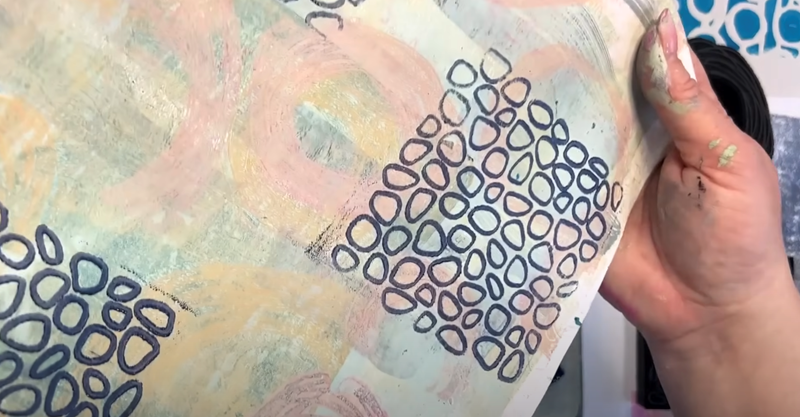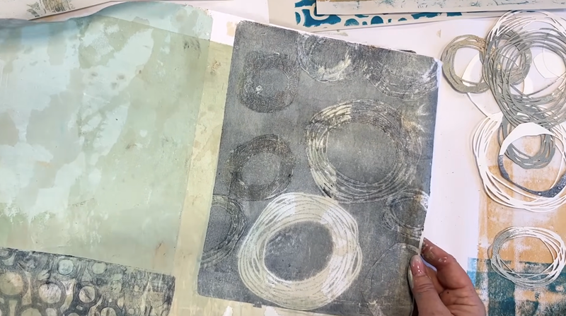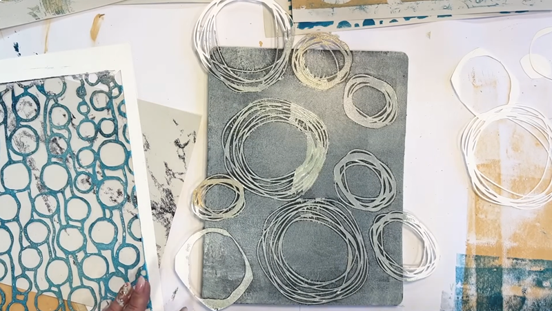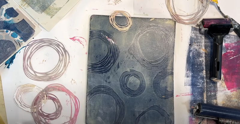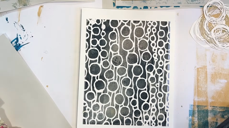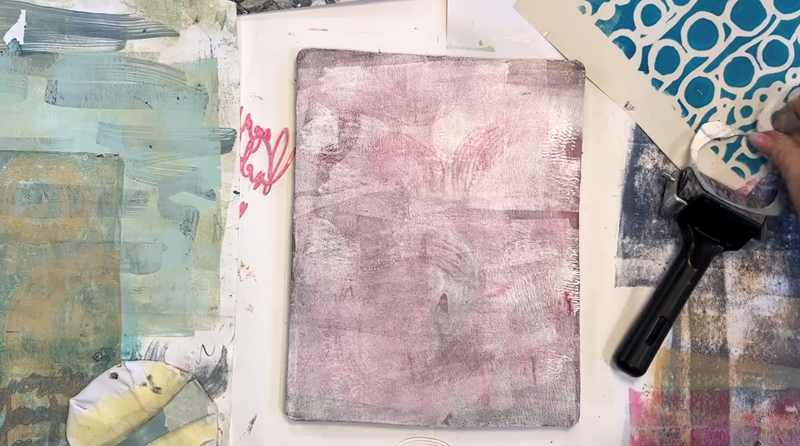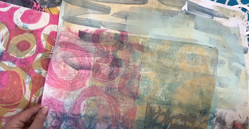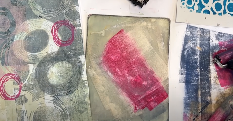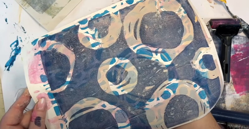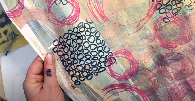 Now I’m just capturing those pink circle shapes left on the Gelli plate—the ghost prints—by rolling a layer of white paint over them.