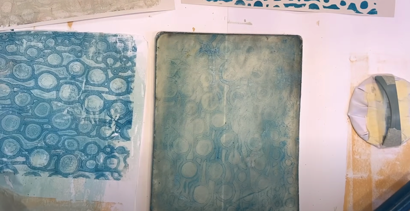 Before I move onto a new stamp and colour, I want to clean up the leftover blue paint from my gel plate using a blank sheet of paper. This can be saved for use in another printing session—nothing ever goes to waste!