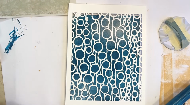 Then, I remove the stencil and pull the print over a blue section of my paper to see what happens.
