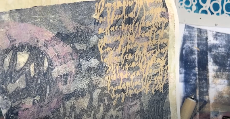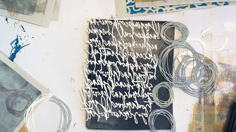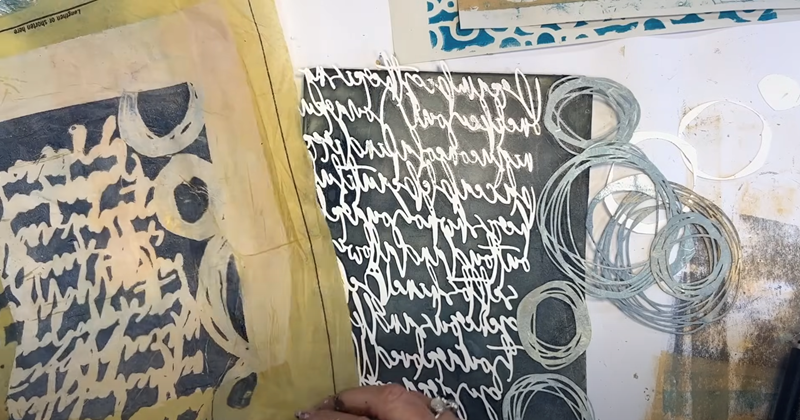 After pulling the first print, there’s usually a bit of paint left on the Gelli plate. This can be picked up as a “ghost print,” which is much fainter. If you work quickly, you can often get two ghost prints before the paint dries. Here, I’ll pull the ghost print onto a paper that already has a design to add some extra interest.