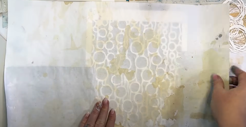 Then, I add the circle stencil to the remaining blue paint on the Gelli plate and pull the ghost print onto my coffee-stained paper. This will create another interesting base layer to build on.