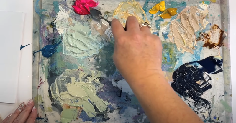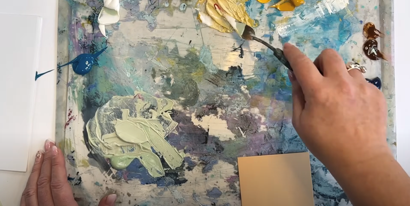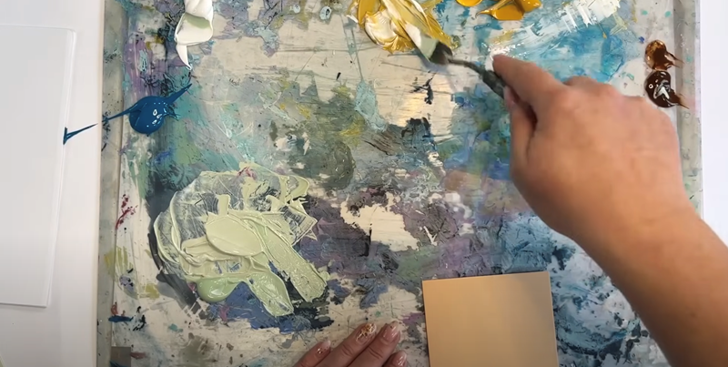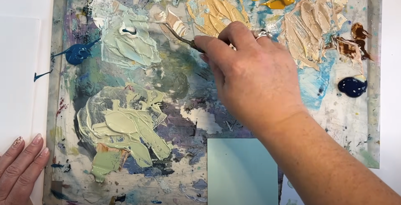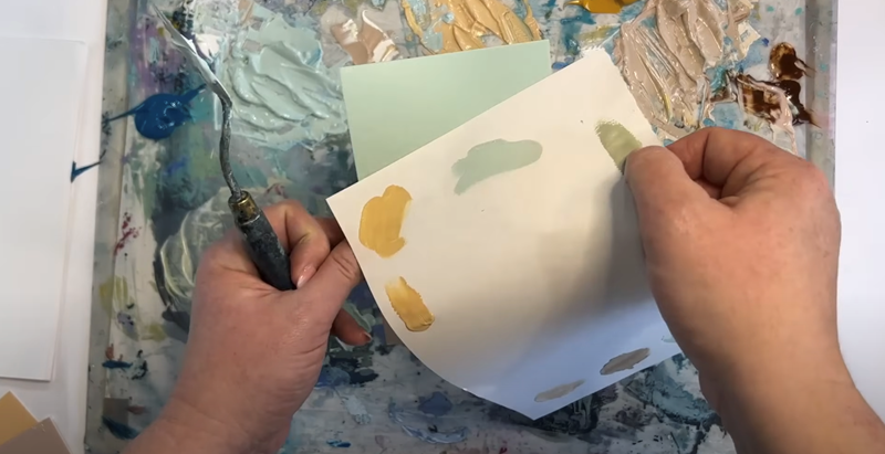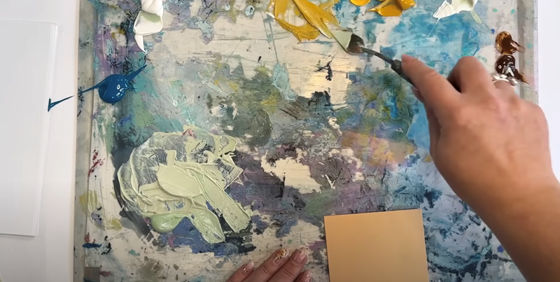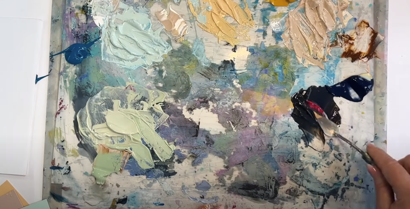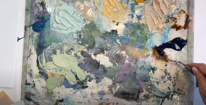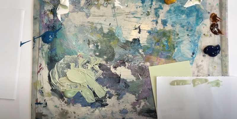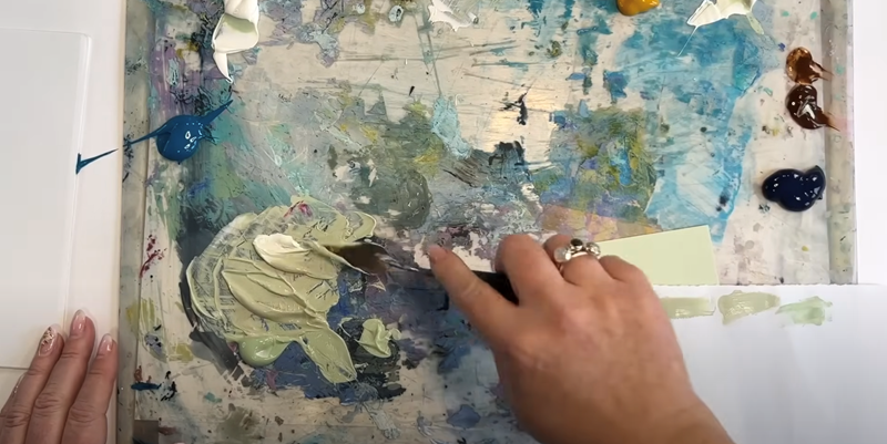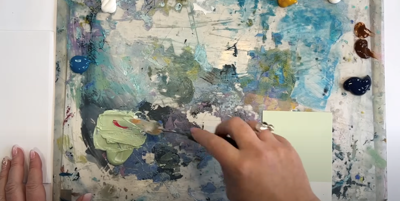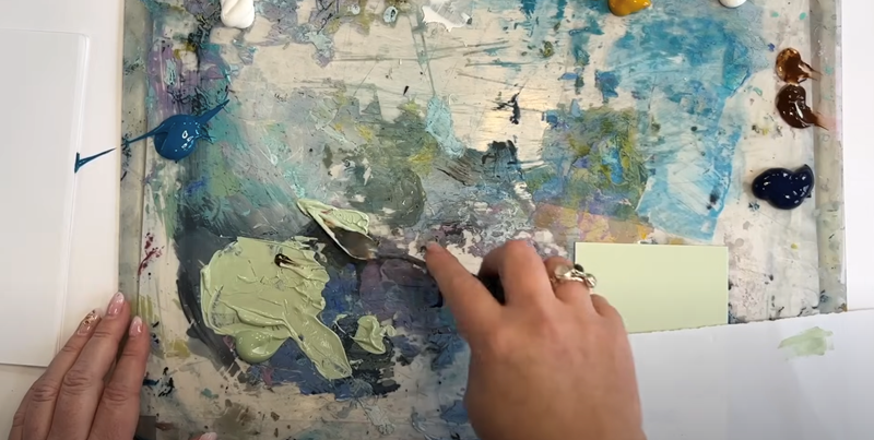 Using a clean palette knife, I mix a bit of turquoise with white. At first, I add a touch of Naples yellow, but then decide my pre-mixed yellow is a better choice to keep the palette harmonious.