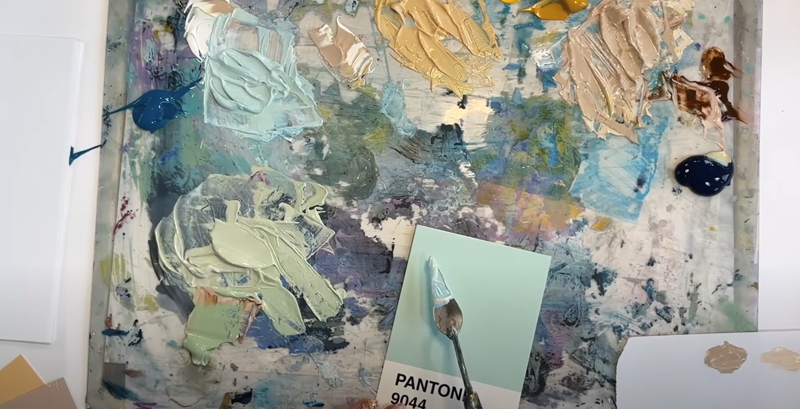 While you can certainly use paint straight from the tube, I’m custom blending a beautiful colour palette selected with Pantone cards, combining cool greens, warm yellows, and a pop of pink.