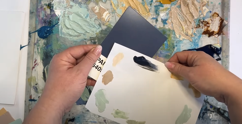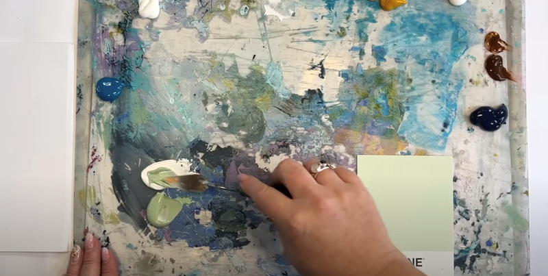 I can see it’s still too green, even with the pink added. To soften it up, I mix in a touch of burnt umber, then gradually add more white—a little at a time—until I’ve got a lovely light shade that’s almost a perfect match for the Pantone green.