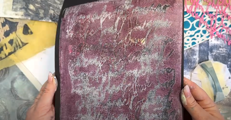 I’m going to give this another go, but this time on a piece of black card. The process is the same: I apply a layer of white paint to the Gelli plate, lay the script stencil on top, and lift the excess paint with tissue. Then, I roll on some pink paint for a pop of colour.