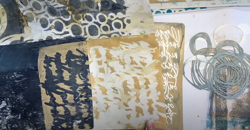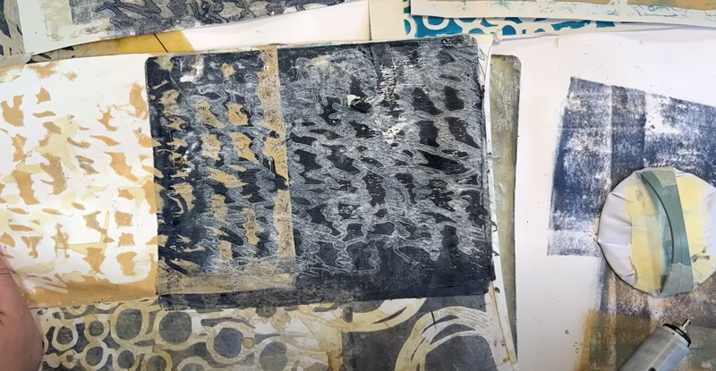 To start, I’m laying down some solid base colours using the Gelli plate. These soft, layered backgrounds are perfect for building up detail later with the stencils and stamps. You’ll see me doing this quite a bit—either creating foundations on blank sheets or adding layers to existing prints. These papers are so versatile and always come in handy for future projects!