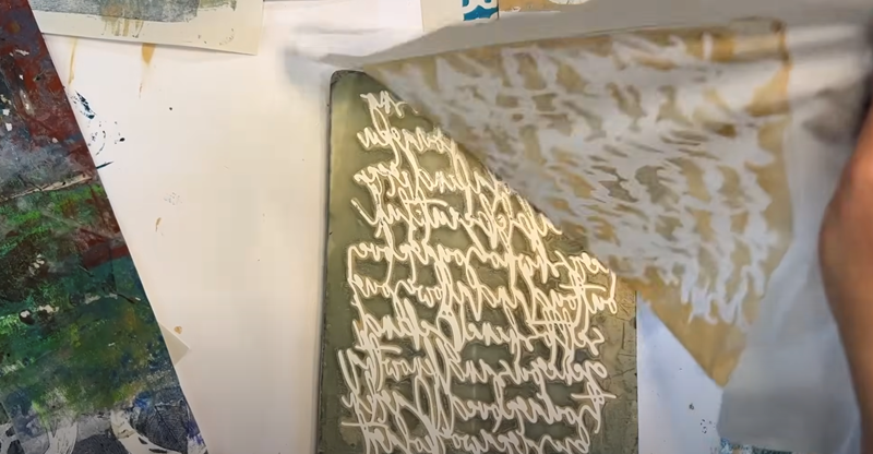 I place a piece of wet-strength tissue paper I’d printed earlier on top, and when I remove it, the two layers lift together beautifully.