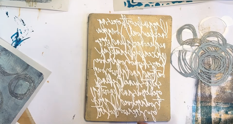 I’m going to combine the nested circles with the script stencil in one print, using a thinner layer of Prussian blue.