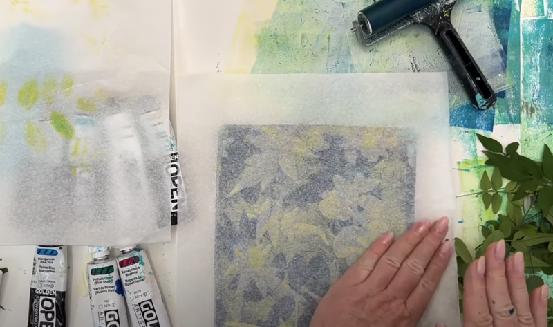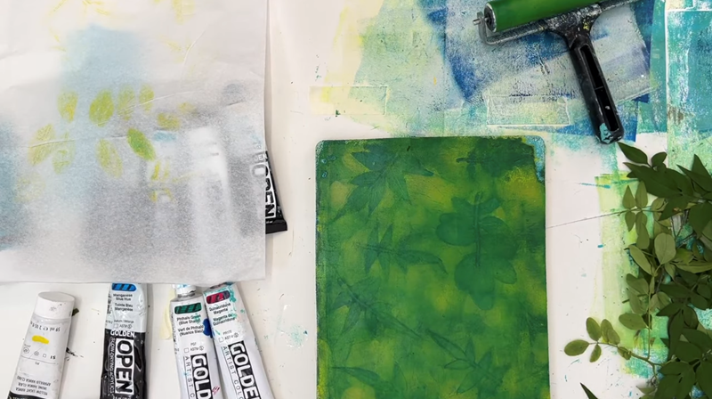 I'm just rolling out a thin layer across the gel plate, and then placing a few more botanicals to fill the space.