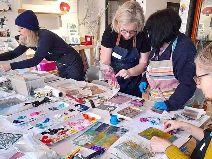 My in-person workshops offer a relaxed, welcoming environment where you can explore gel printing, encaustic wax and layered mixed media techniques with hands-on guidance.