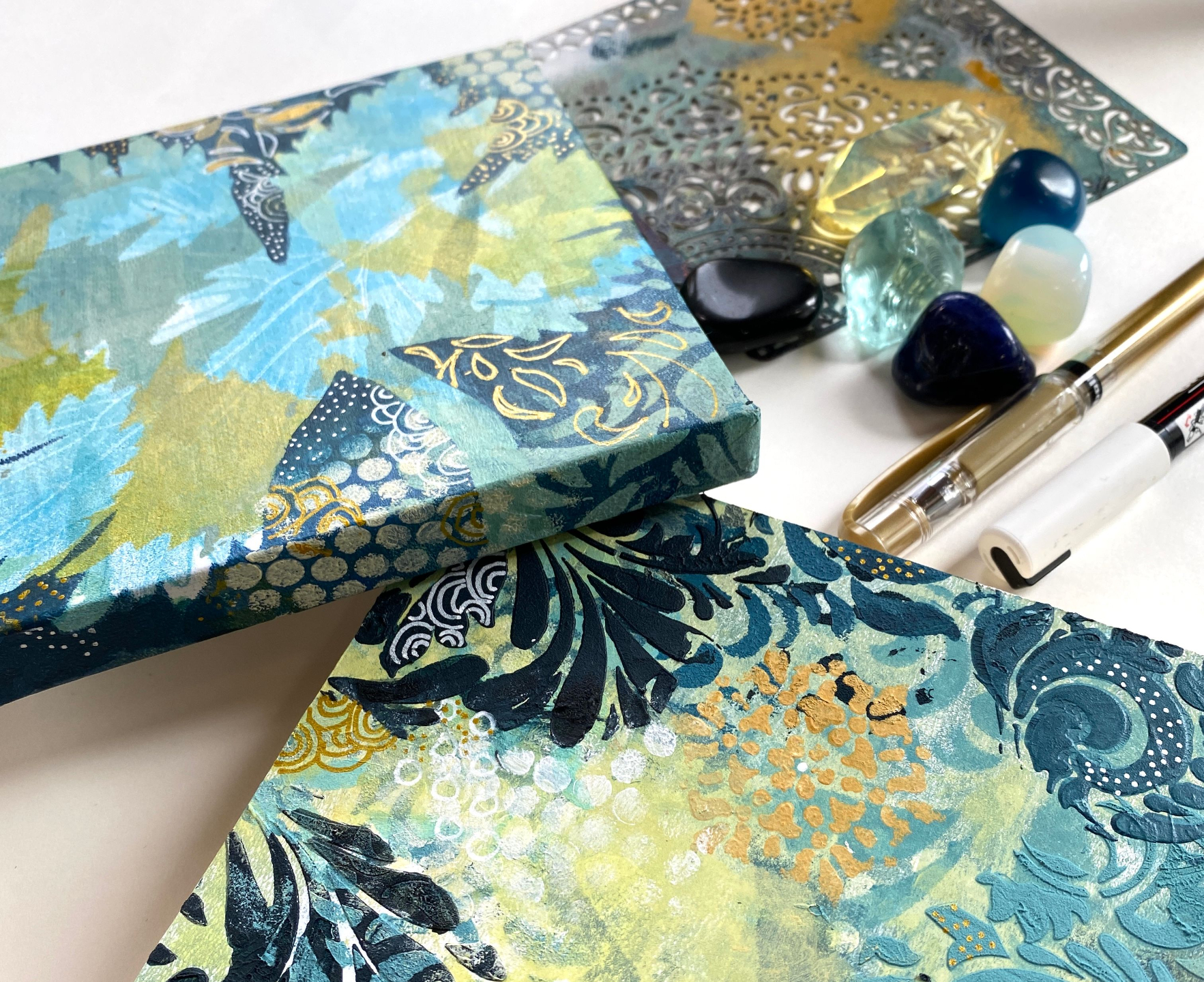 From beginner-friendly introductions to in-depth layered techniques, my courses guide you step by step through gel printing, encaustic wax and mixed media processes.