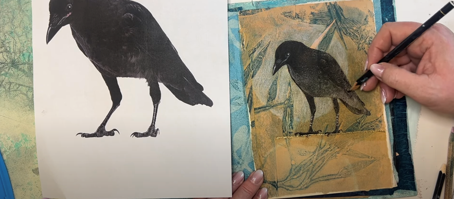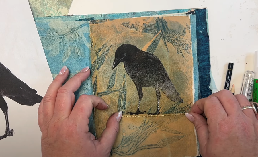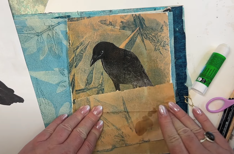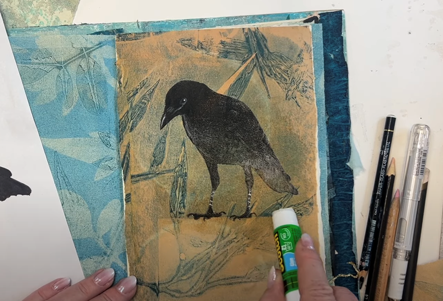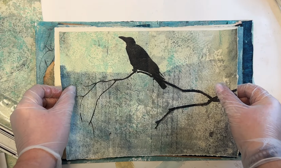 Next, I'll repeat the same process as in Print 1, adhering the bird to the background and allowing the print to dry before trimming it to fit the book.