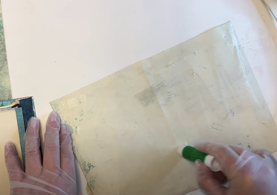 I've got my gloves to protect my hands, some matt medium to adhere the layers, some brushes, and my Catalyst Wedge for smoothing out the papers after I've glued them. Since the tissue paper is so thin, I start by brushing a bit of matt medium on the bottom layer, which is a thicker paper.