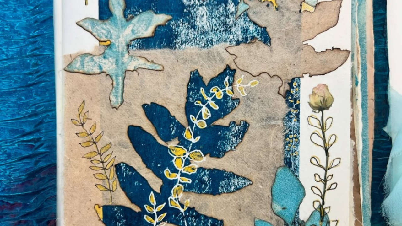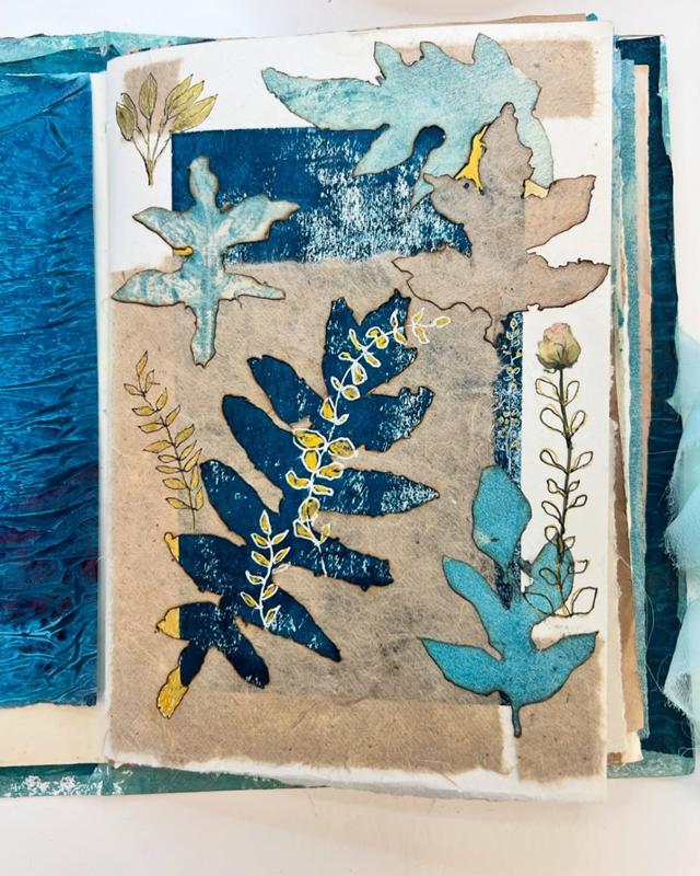 I love how the natural tones of the handmade paper sit against the blue background. I place my leaf cut-outs on the page, letting them extend over the edges and shifting the direction slightly so the composition feels more organic and relaxed.