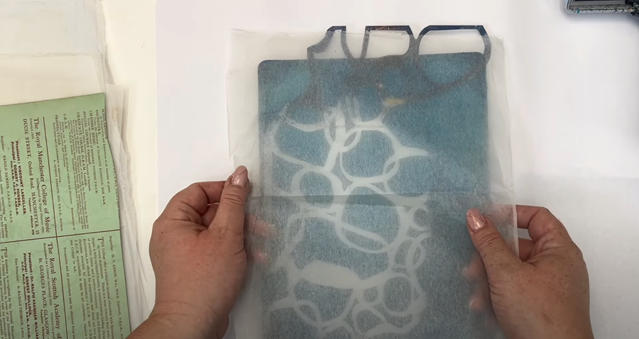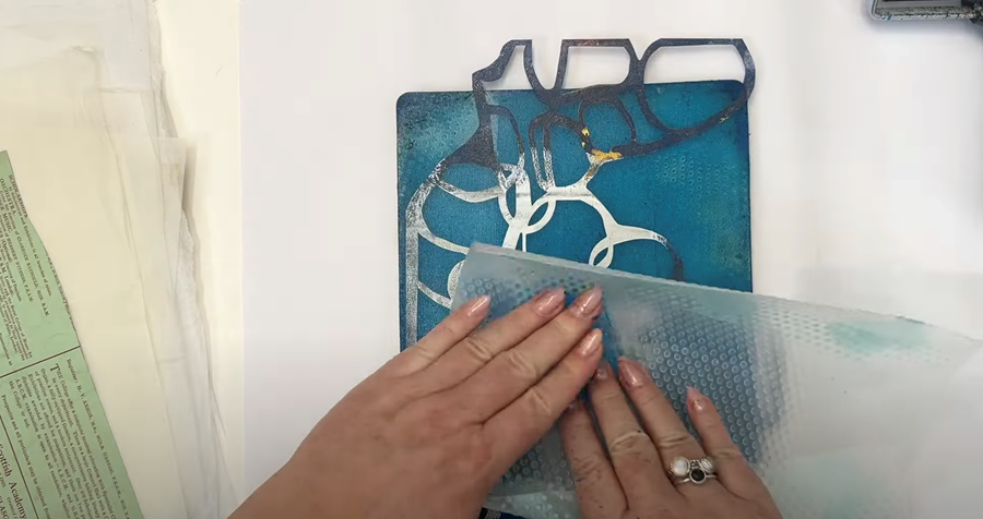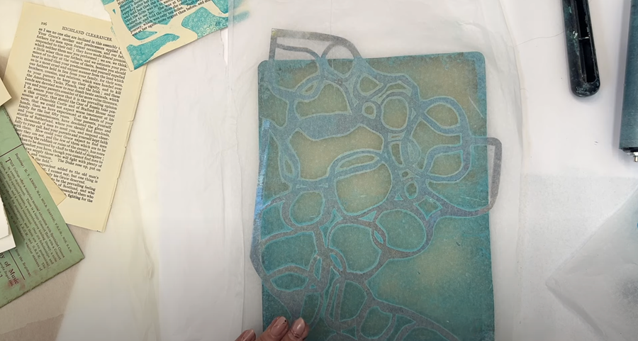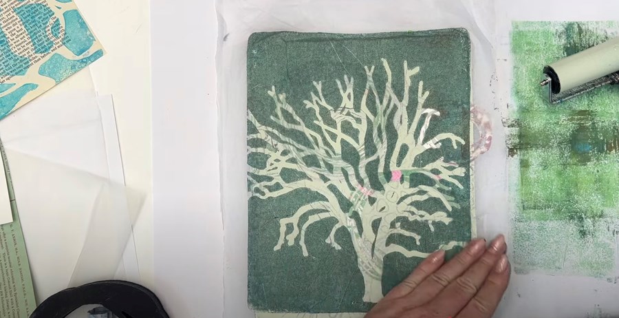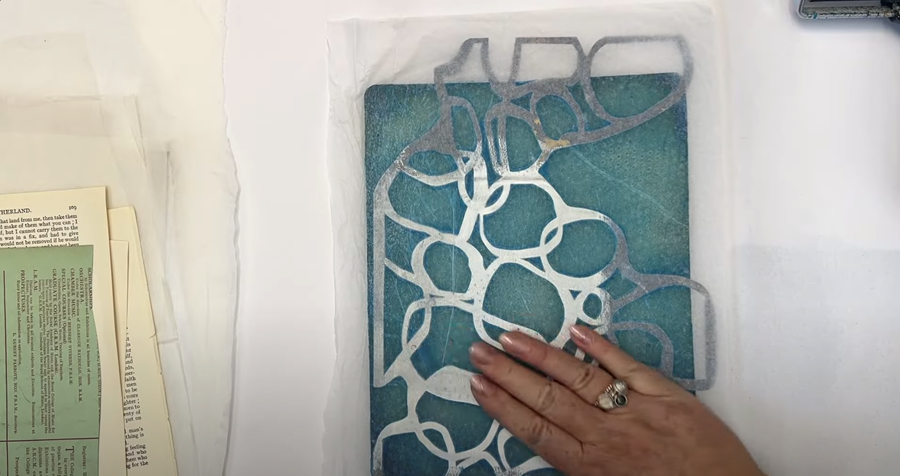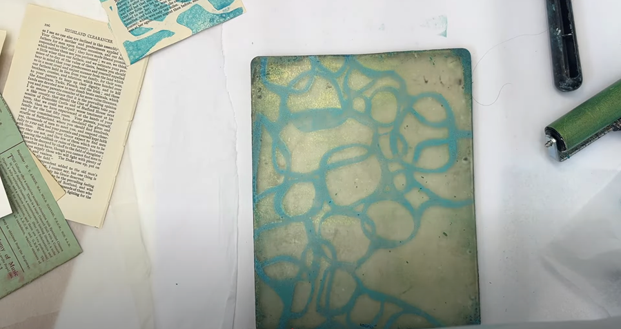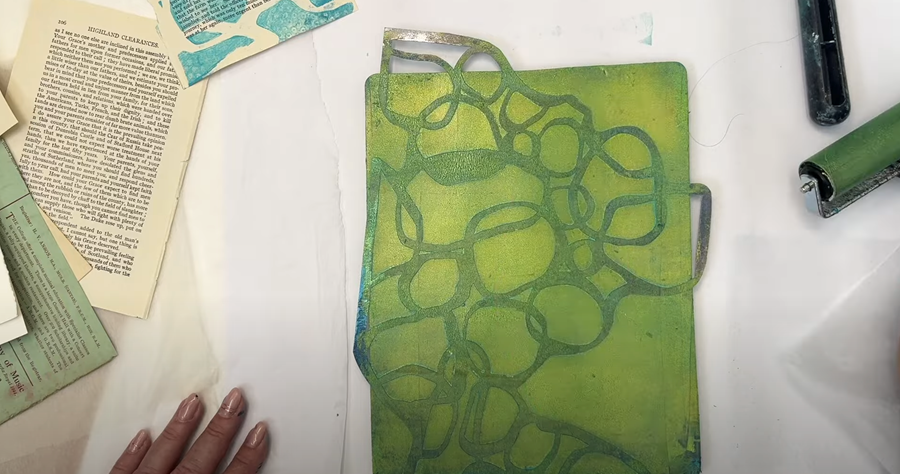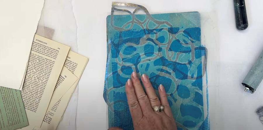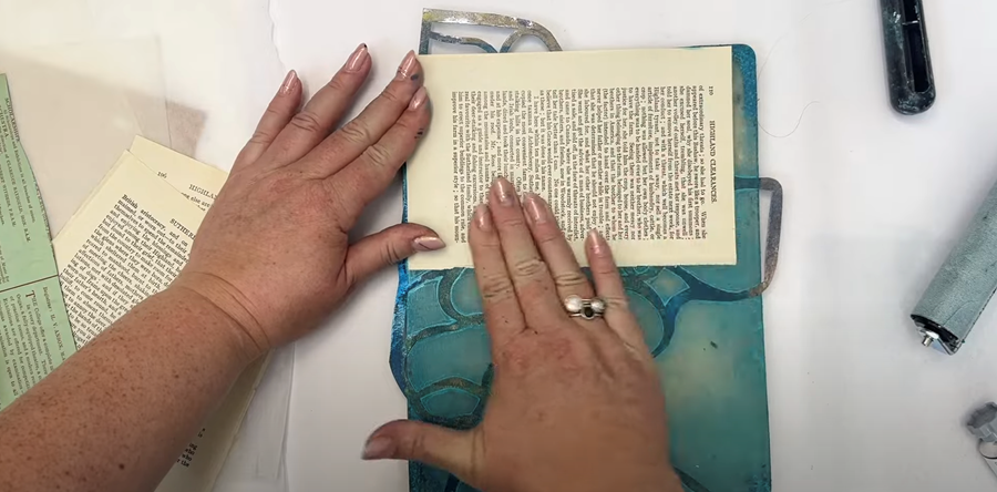 Next I try a book page across the top, smoothing it out with my hand to ensure it picks up the remaining paint on the gel plate.