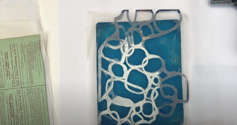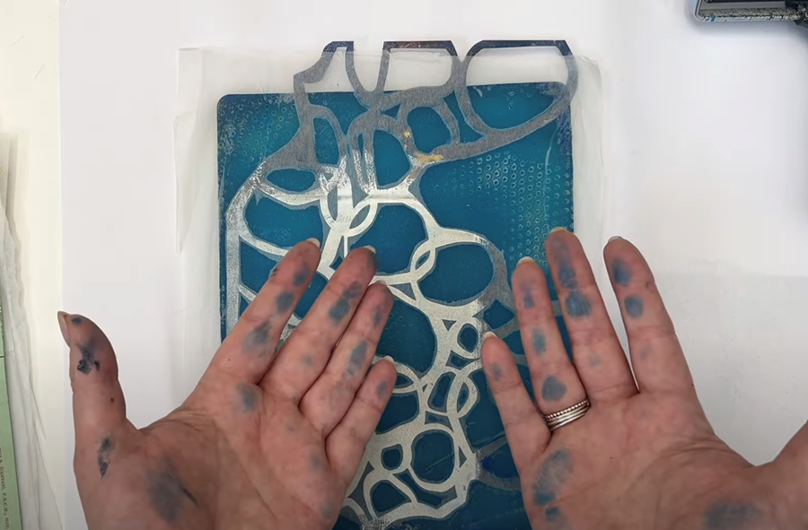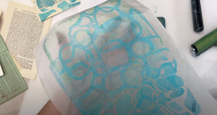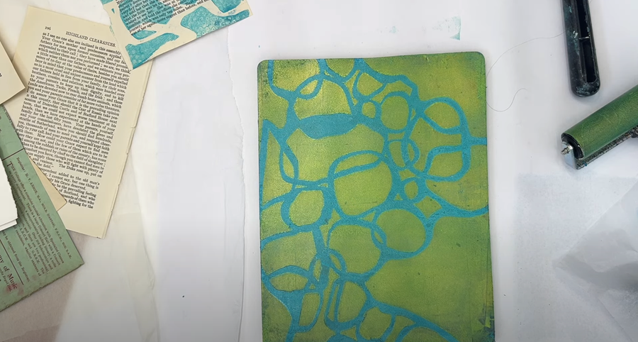 Sticking with the Golden Open Acrylics, I’m now adding a layer of Teal paint onto the gel plate. I’m not bothering to clean my roller in between - I’m just blending what’s left of the Manganese Blue with the Teal.