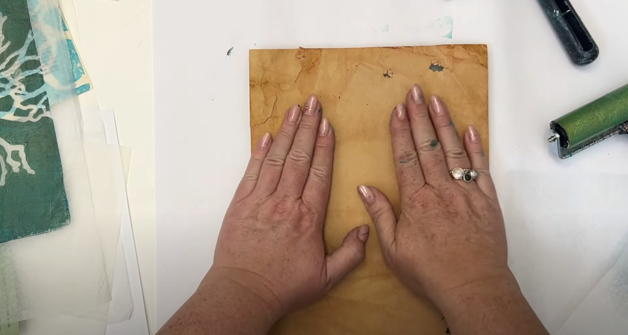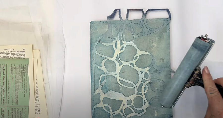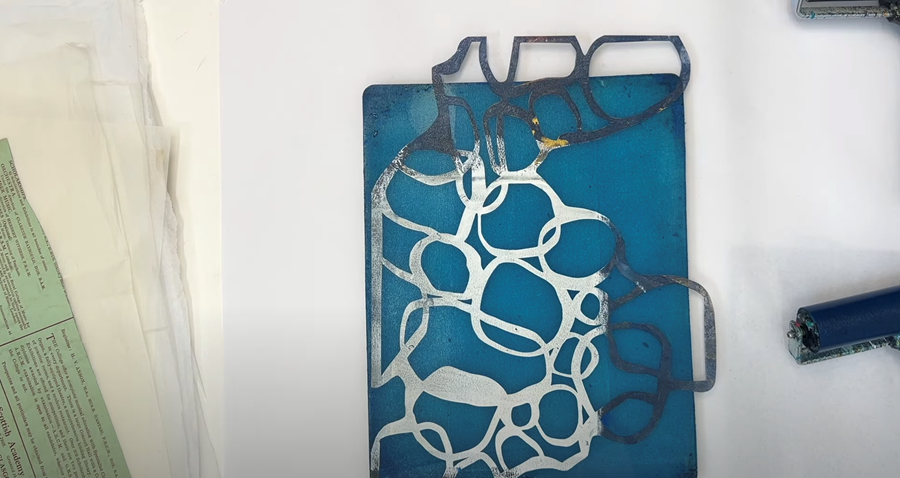 I’m swapping out my roller for a clean one, and I’m going to add a very thin layer of Golden’s Open Acrylics in Titan Buff over the top of the plate.