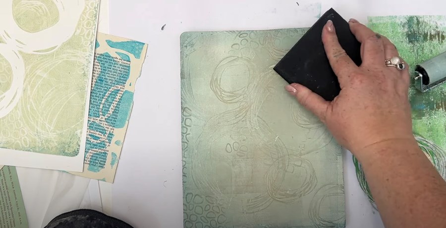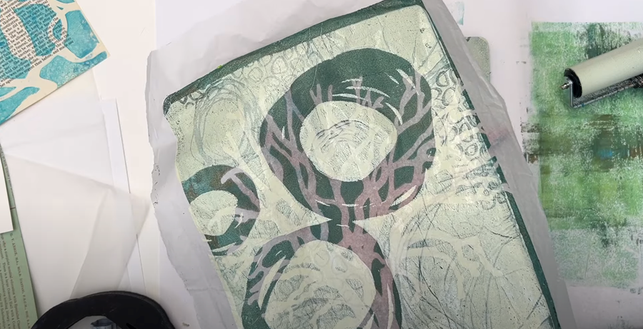 Then, I roll the leftover paint from the brayer onto the gel plate to create another thin layer - and stamp it lightly again.