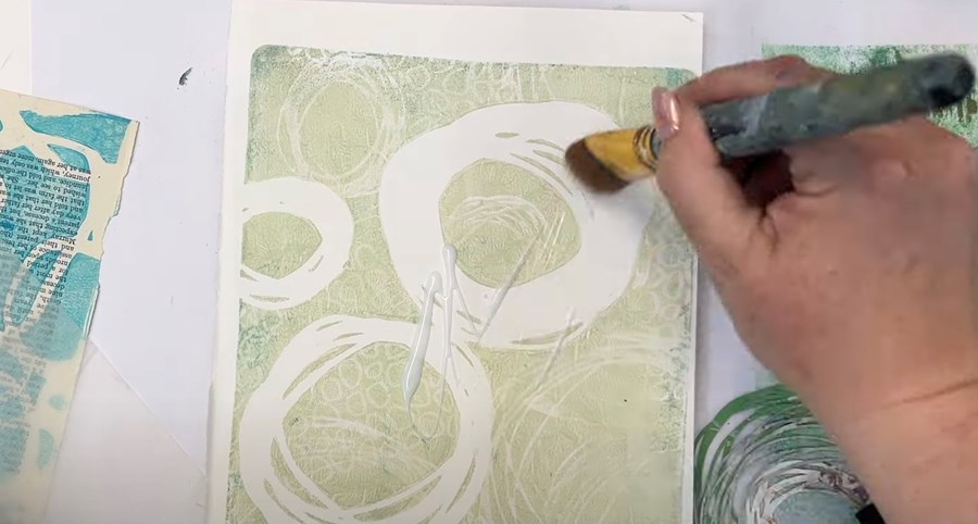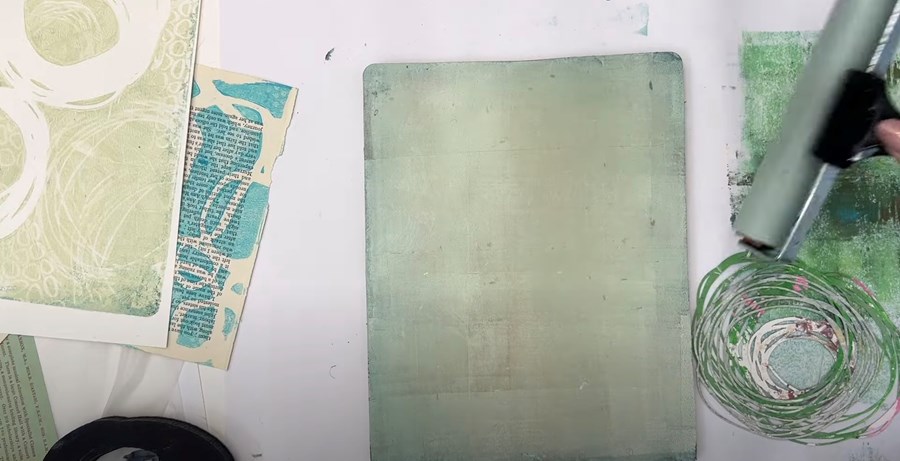 I'll start with a fresh colour on the gel plate - Golden’s Titan Green Pale. After rolling it out evenly, I add a few small nested circle stencils over top. I'm also using foam stamps to create a few small circular patterns.