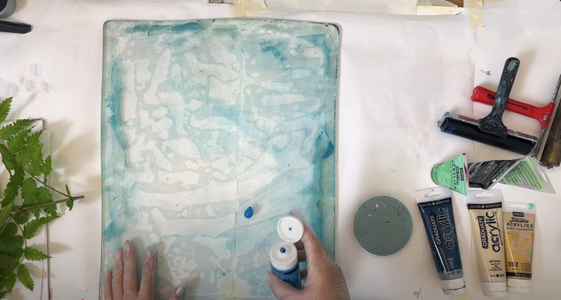 This time, I'm trying out a layer of Golden Fluid Acrylics in Teal on the gel plate — it’s a lovely opaque paint that will create a strong, solid background.