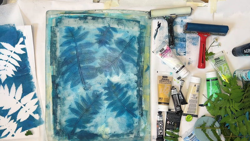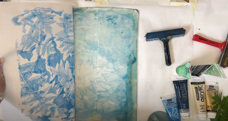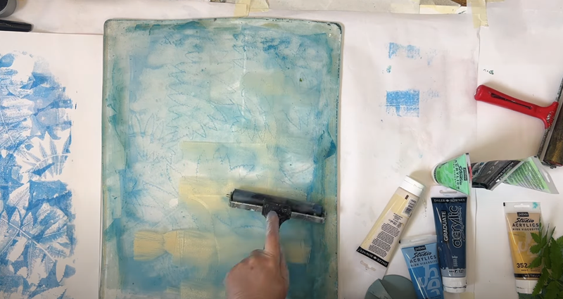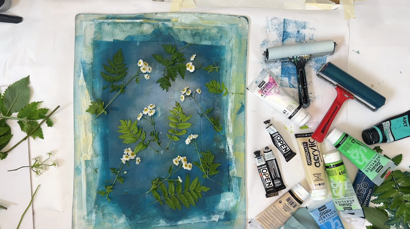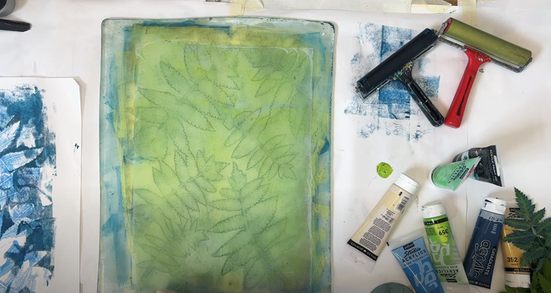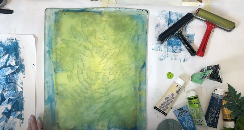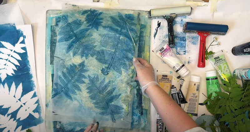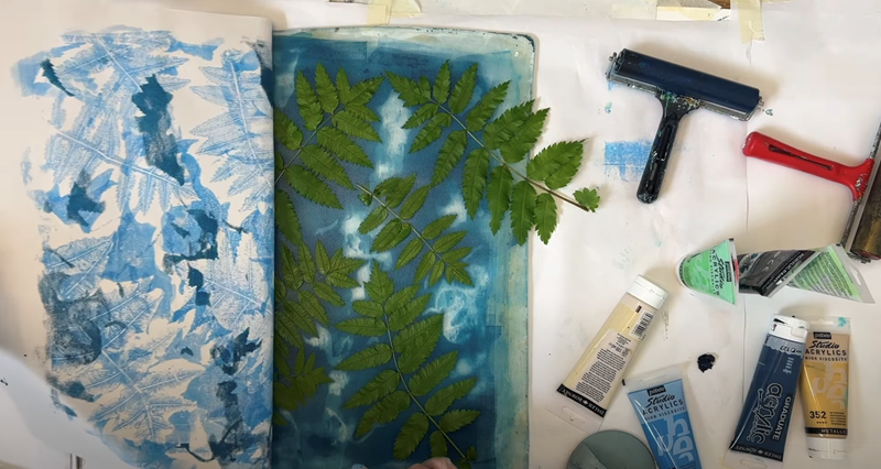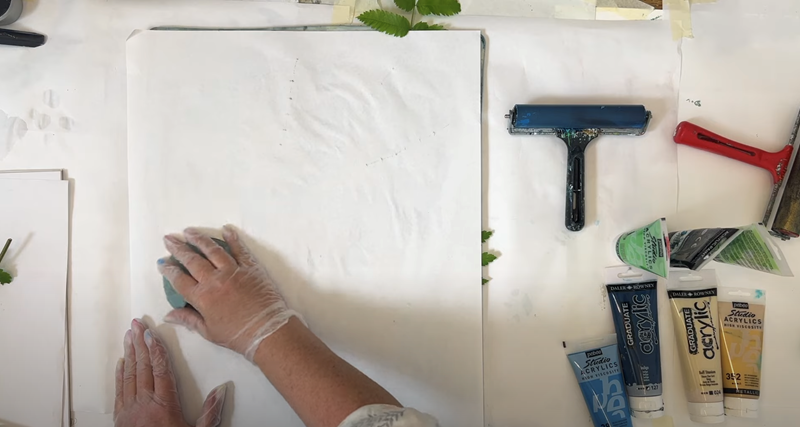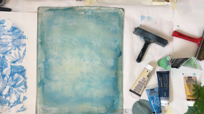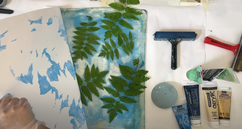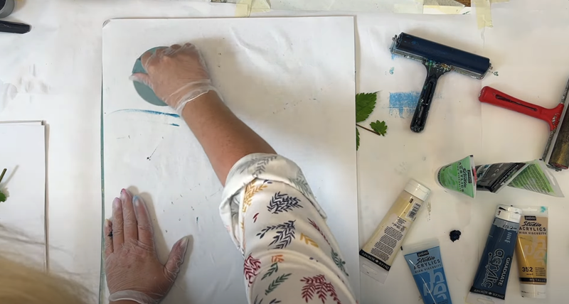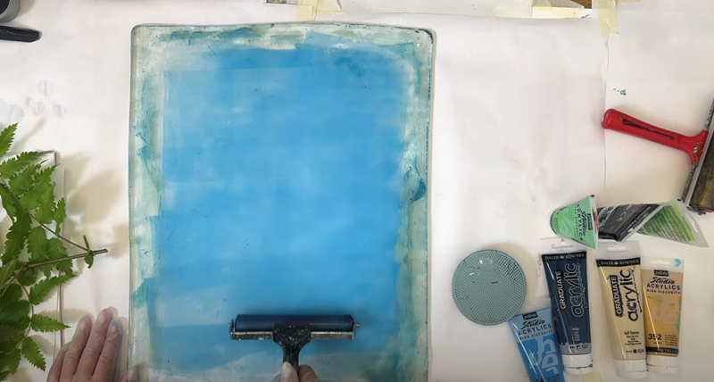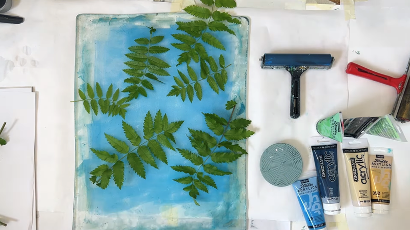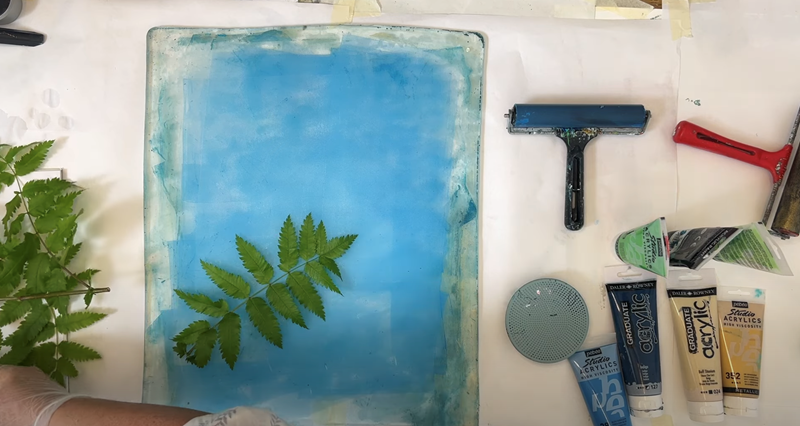 We’ll begin by applying a small amount of Cerulean Blue paint straight onto the gel plate. Using my brayer, I gently roll it out into a smooth, even layer—just enough to cover the surface without streaks or thick patches. I'm aiming for a clean base that will beautifully capture the textures of my plant materials.