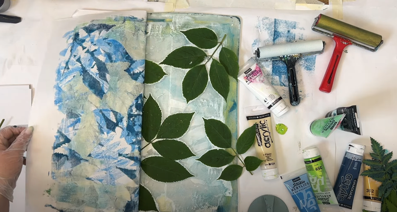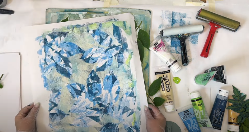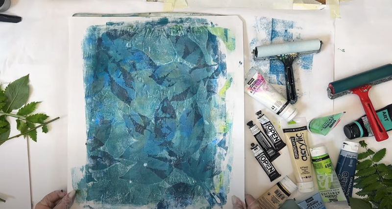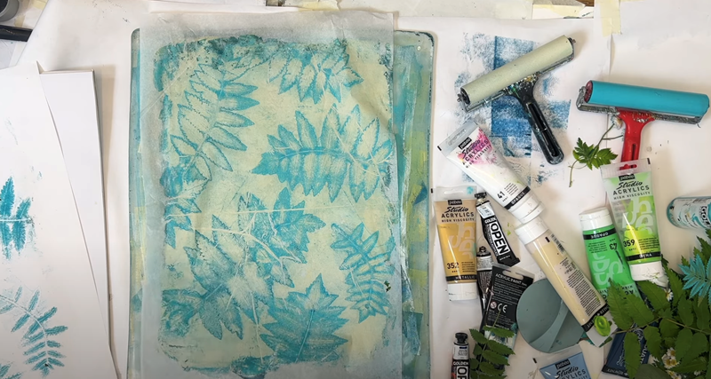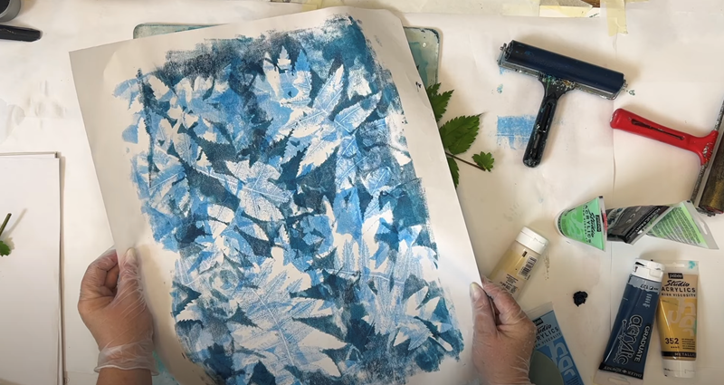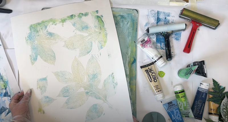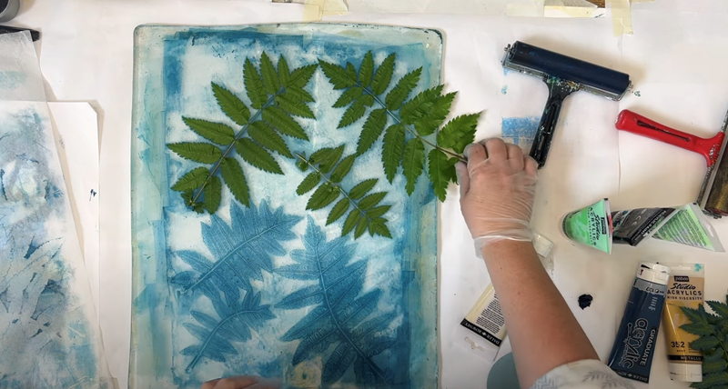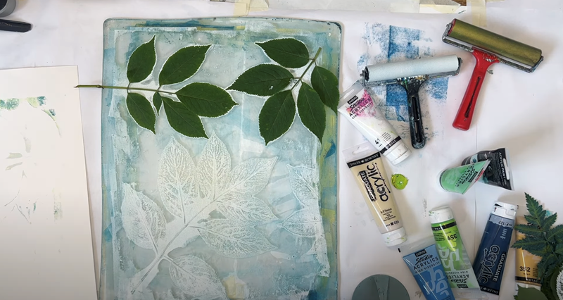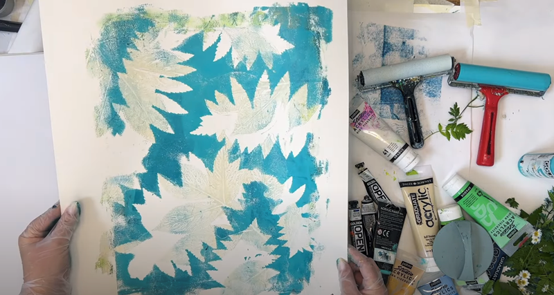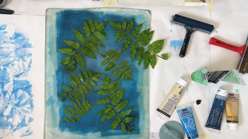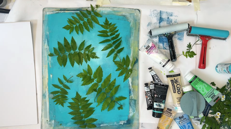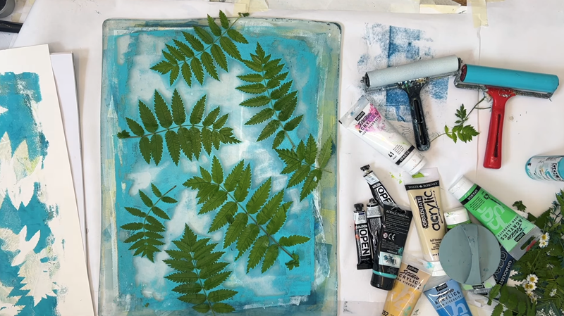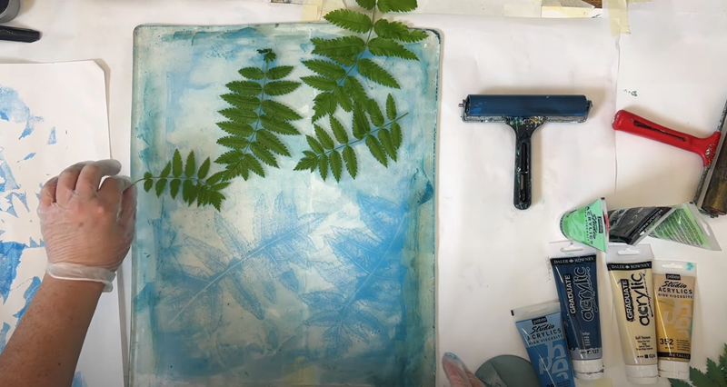 I’m using a few of the same leaf shapes here—nice and flat, so they pick up the paint well—and placing them in different directions across the surface of the gel plate. I like to let the shapes overlap slightly or curve naturally as they would in the garden.