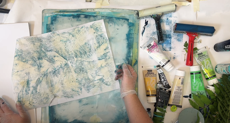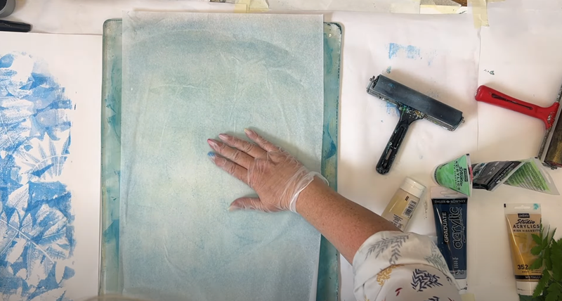 Next, I gently press my tissue paper print from Part 5 onto the gel plate to pick up the remaining teal paint.