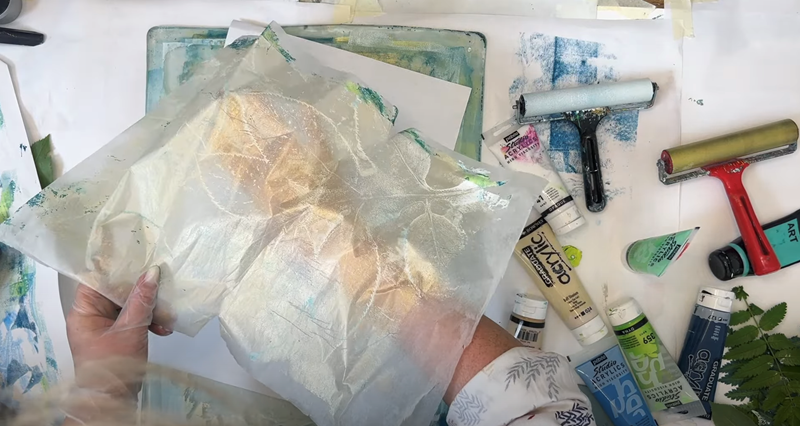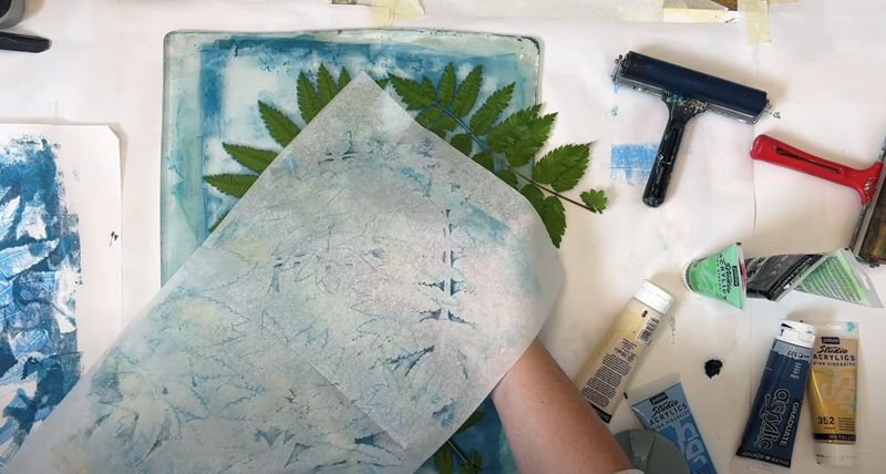 Next, I remove the leaves and apply a layer of Buff Titanium onto the gel plate to help lift off the ghost print. I lay a fresh piece of tissue paper down and pull carefully.