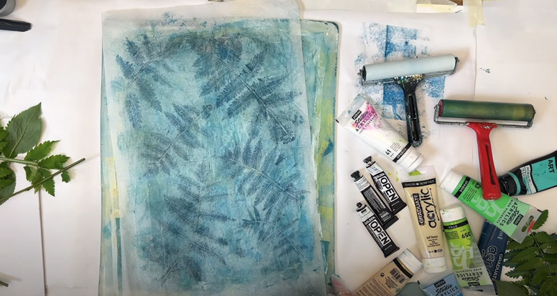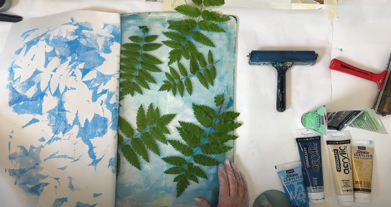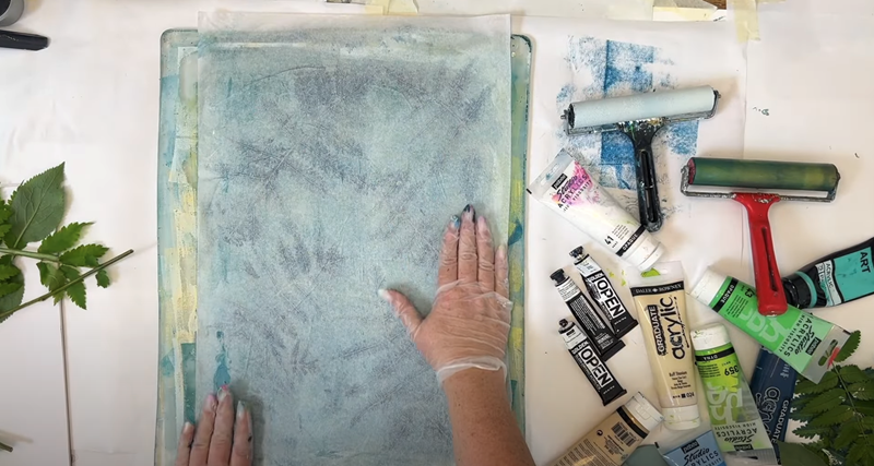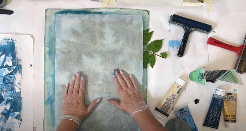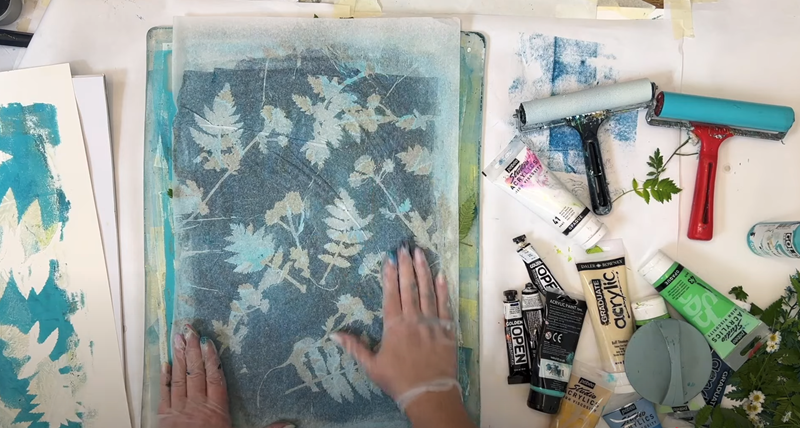 I apply a sheet of paper over the top (I’m using sketchbook paper). I gently smooth it out with my fingertips, pressing around the leaves to ensure the paper makes good contact with the paint.