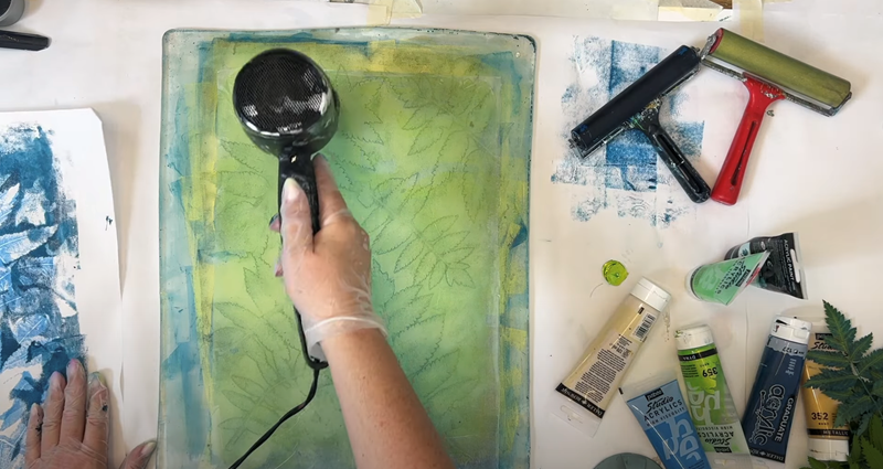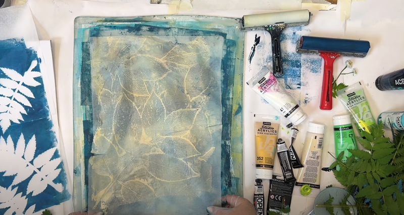 Now I’m going to capture that ghost print again, this time using a little bit of iridescent green yellow—it's such a lovely colour for picking up delicate details.