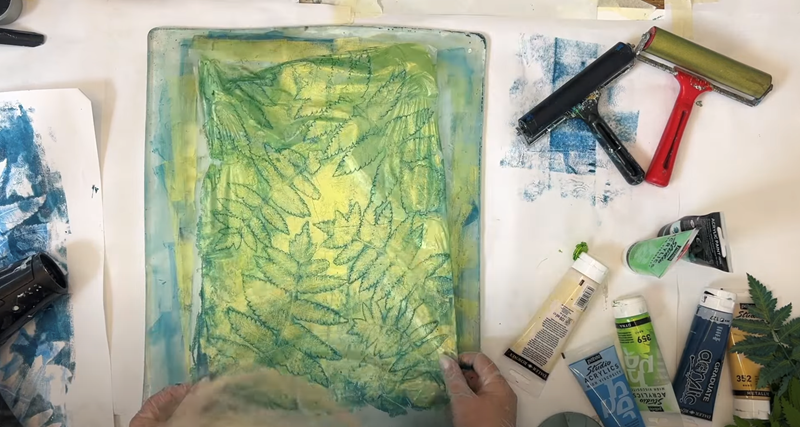 Now I’m going to pull up the remaining paint left on the gel plate, right on top of the tissue print I made in Part 2.