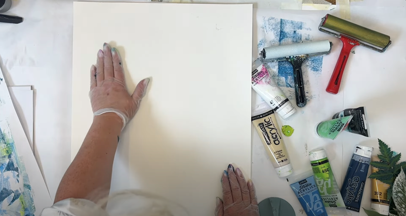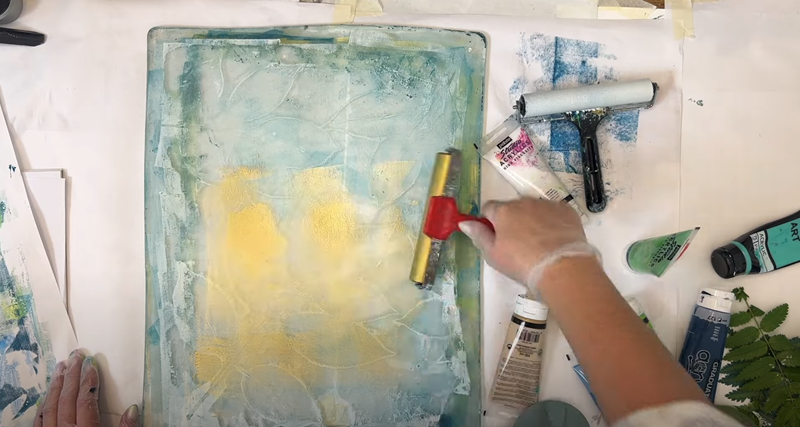 Once again, I gently smooth the paper out with my hands, then roll over it with the brayer to ensure full contact.