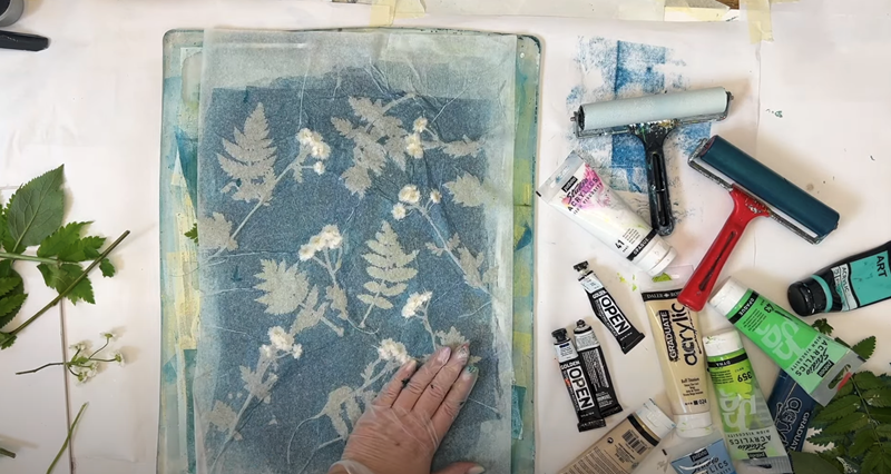 Now, I place a piece of tissue paper over the top, and with my hands, I gently press around the plant material so it makes good contact with the paint. I carefully remove the tissue to reveal the print.