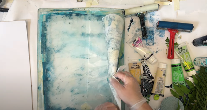 I'm starting off with another layer of teal blended with my Open Acrylics, rolled out to a thin, even layer.