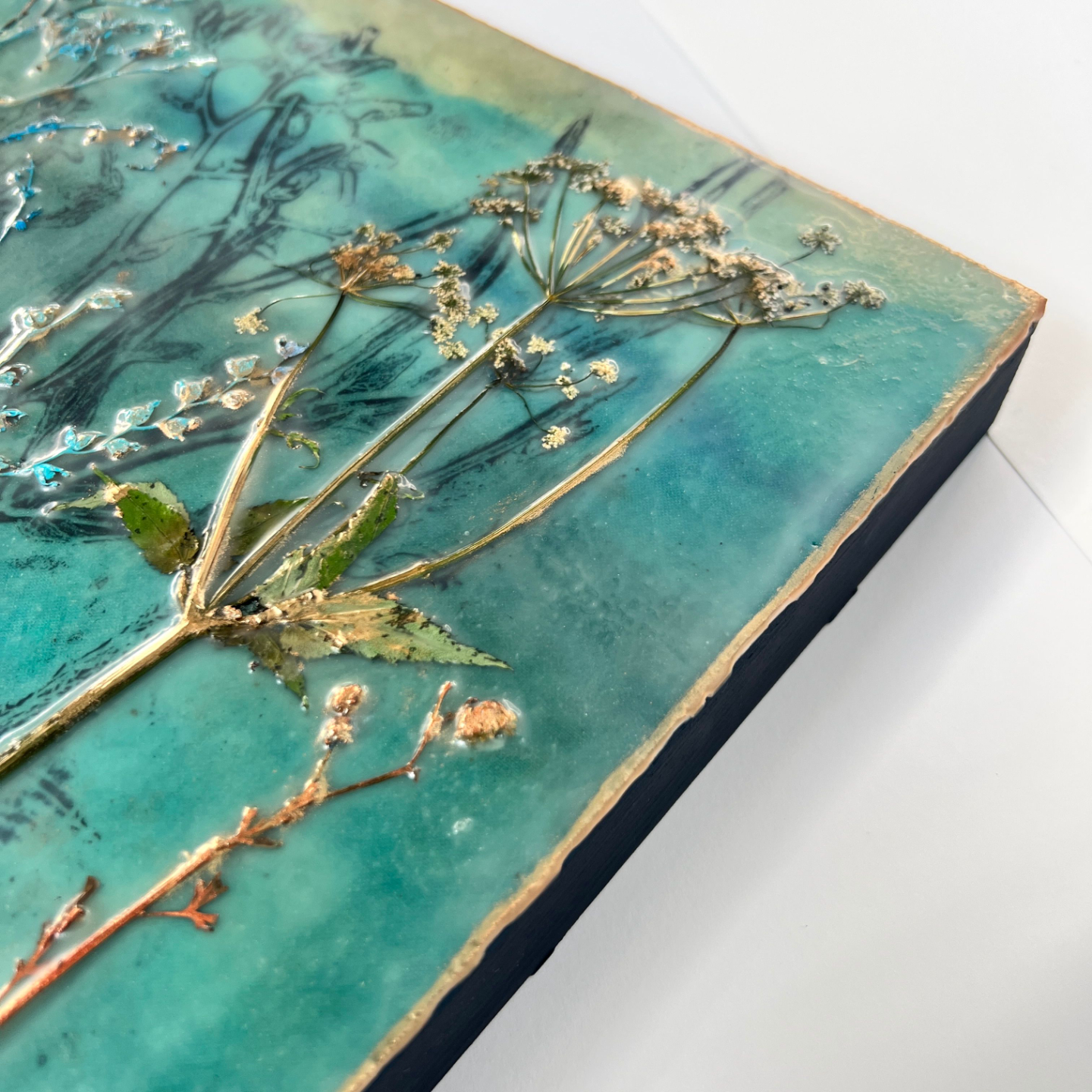 Apply layers of wax, embed pressed plants, and use a heat gun to fuse the layers. Add depth, softness, and detail.