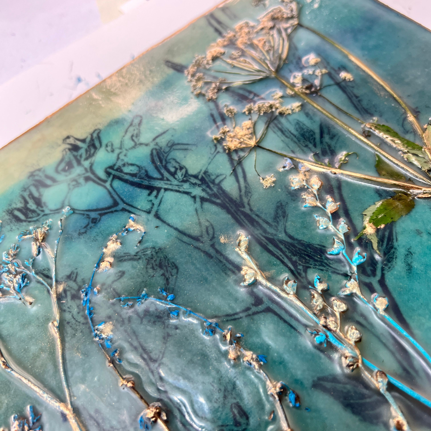 Layering encaustic wax over your fabric prints, embedding dried plants