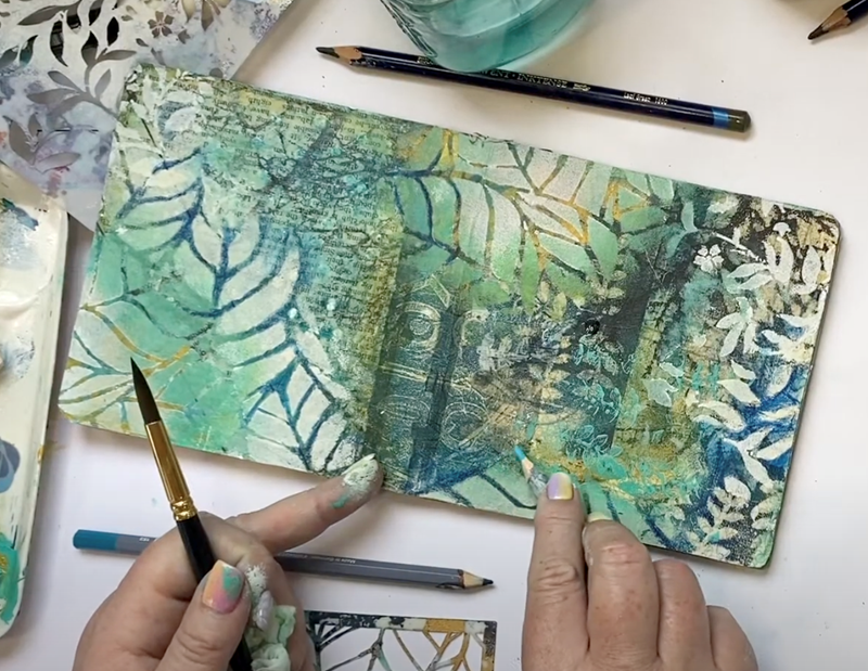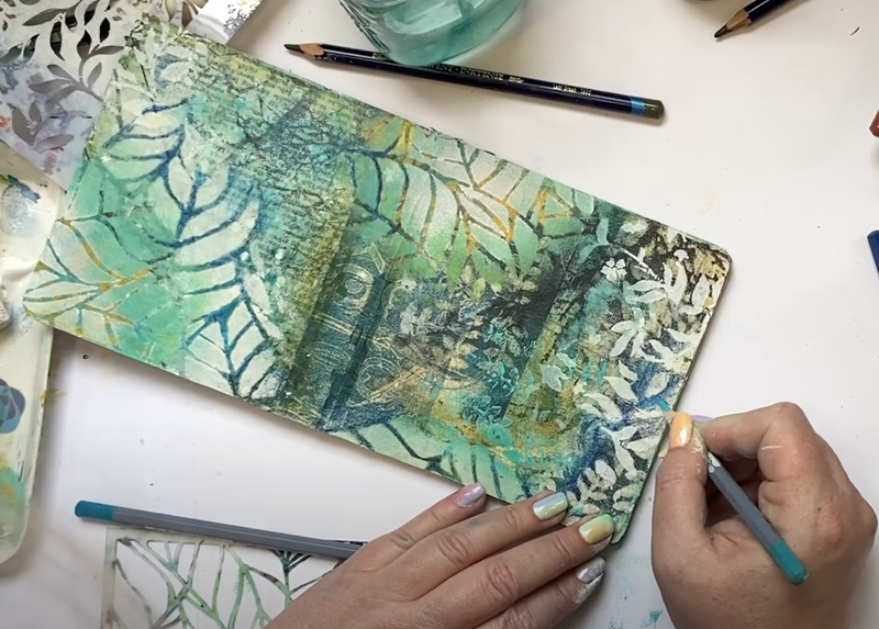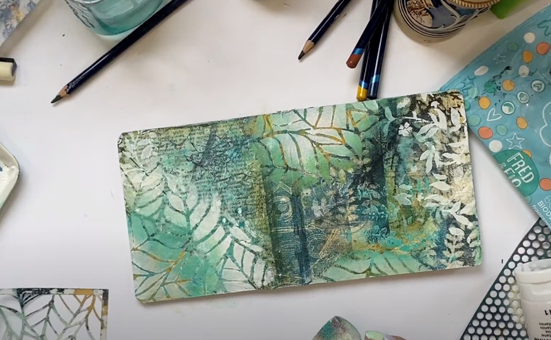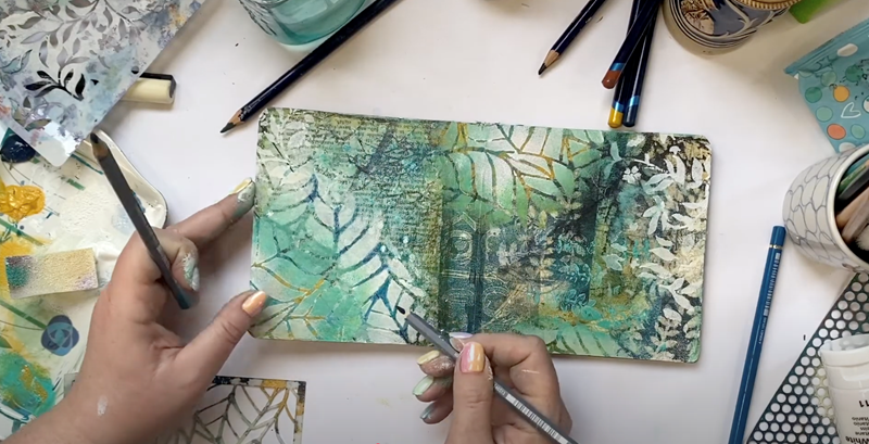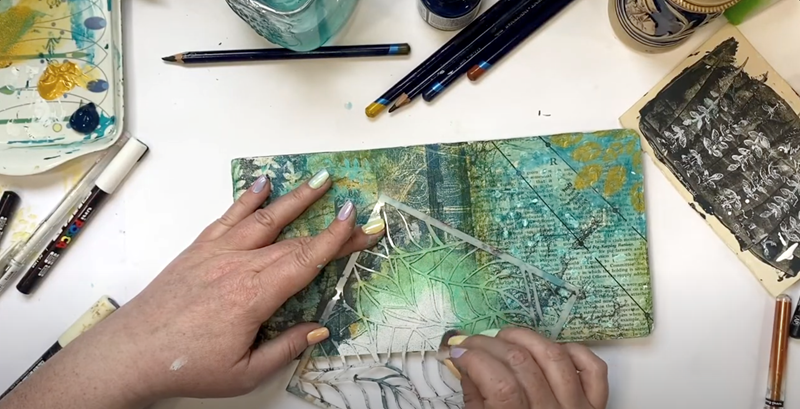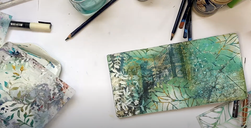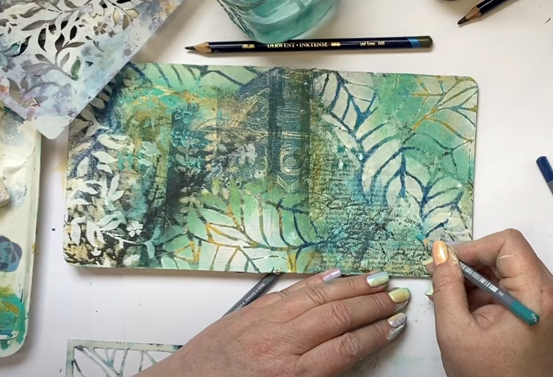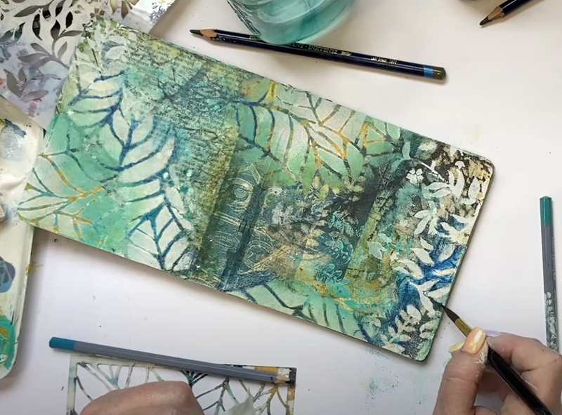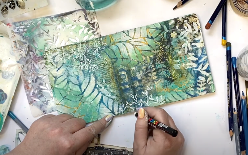 I flip the book round, then reach for my larger leaf stencil. I add a leaf pattern over top using the same whites and teals to keep it harmonious.
