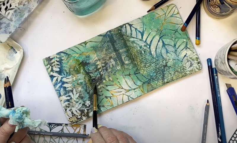 These pencils are water soluble, so you can blend them with just a bit of water and a brush. I go in with the brush, dabbing off the excess water on a bit of tissue so it’s not too wet, and blend out the colour, adding in a touch more teal pencil as I go.