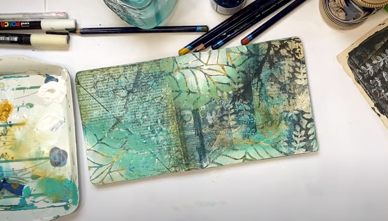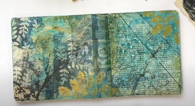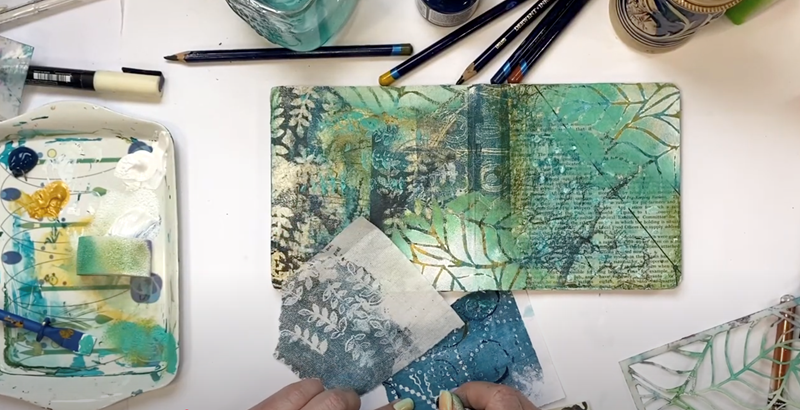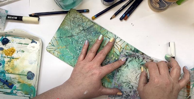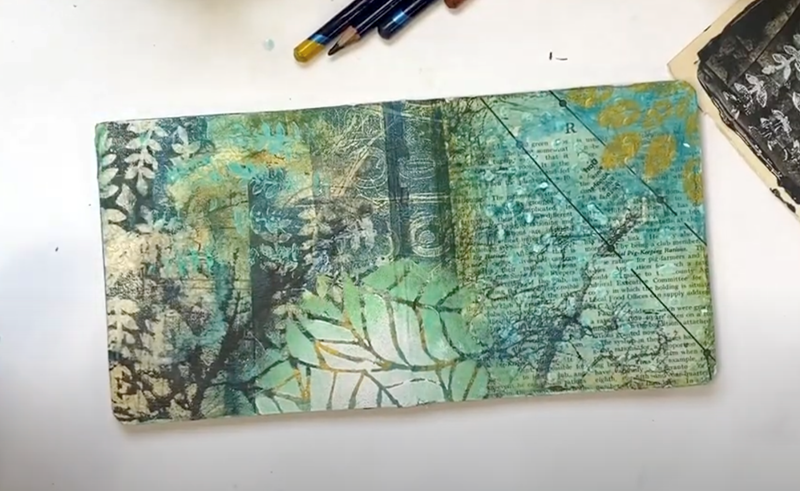 I’m working on the collage I started in Part 1, but you can absolutely use your own Gelli-printed papers—whether they’re botanical prints, text-based designs, or stencil patterns.