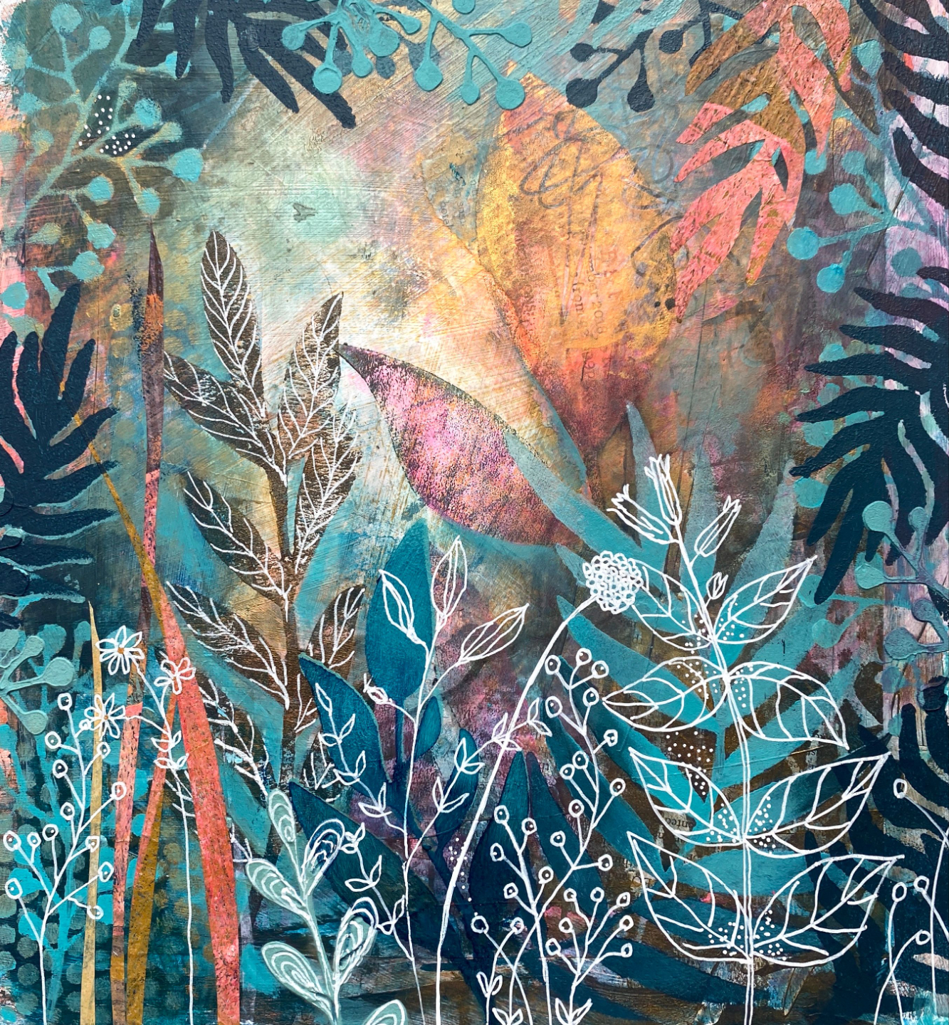 Using slow-drying Golden Open Acrylics and a 16Ć20 inch Gelli plate, I work through multiple layers, different leaf shapes, and a variety of papers āĀ from aged sketchbook pages to coffee-dyed envelopes and tissue paperĀ ā to show you how a considered, unhurried approach leads to something reallyĀ quite beautiful.